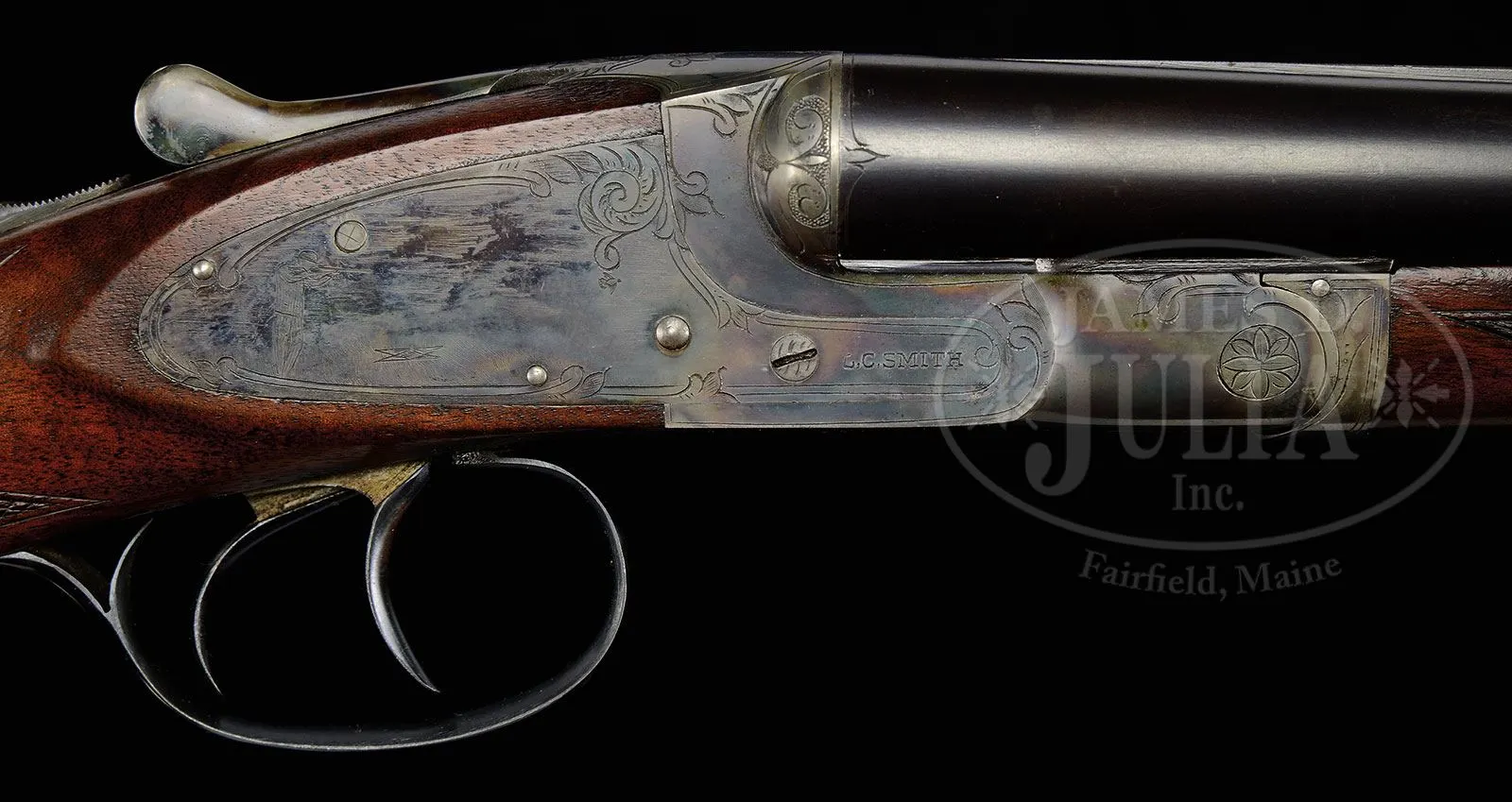 *VERY FINE HIGH ORIGINAL CONDITION L. C. SMITH 20 GAUGE TRAP GRADE.SN FWE103389. Cal. 20 ga. 2-1/2″ Chambers. 28″ Bbls with concave, matted, game rib are marked “L.C. SMITH TRAP GRADE” and “HUNTER ARMS CO., INC. M’F’R’S FULTON, N.Y. U.S.A.” on tops. Sides of breech ends are engraved with bits of scroll. Bbl flats are stamped with SN, grade, and Hunter proofs. Case hardened action with SN and grade on water table, features non-automatic safety and double triggers. Action is engraved in typical “Trap” grade style with 30% coverage simple scroll. Lockplates have matching scroll surrounding vignettes of trap shooters; a group of five on line shooting clay targets on left, and a single shooter on right aiming at pigeon just released from trap. “L.C. SMITH” is stamped at front of each lockplate. Trigger guard is scroll engraved on bow, and has SN at grip. Lightly stump figured American walnut capped pistol grip buttstock measures 14-1/2″ over open sided HAWKINS pad, and features point pattern checkering with line borders which continues over grip. Matching splinter ejector forend has contrasting wood tip and guitar shaped secondary latch escutcheon. Bore diameter: left -.613, right -.615. Bore restrictions: left -.028 (full), right -.020 (Mod). Minimum wall thickness: left -.036, right -.034. Drop at heel: 2-7/8″, drop at comb: 1-11/16″. Weight: 6 lbs 5 oz. LOP: 14-1/2″. CONDITION: Exceptionally fine. Bbls retain 95%+ orig blue, with only a hint of edge wear on rib, and slight silvering at muzzles, with a few scattered marks. Action retains 90% + orig case hardening color, thinning and silvering a bit around bottom, and with some light flecking. Lockplates retain essentially all of their color. Trigger guard retains nearly all of its bright blue. Blue of forend escutcheon is silvered to about 80%. Stocks retain nearly all of their orig finish, grain open, with a number of light marks and scratches, checkering very lightly worn and dark. Bores are excellent. Action is tight. Ejectors are in time. Exceptionally fine specimen of this relatively scarce L.C. Smith, with only 356 made in 20 ga. 4-55365 (7,000-10,000) – Lot 2601