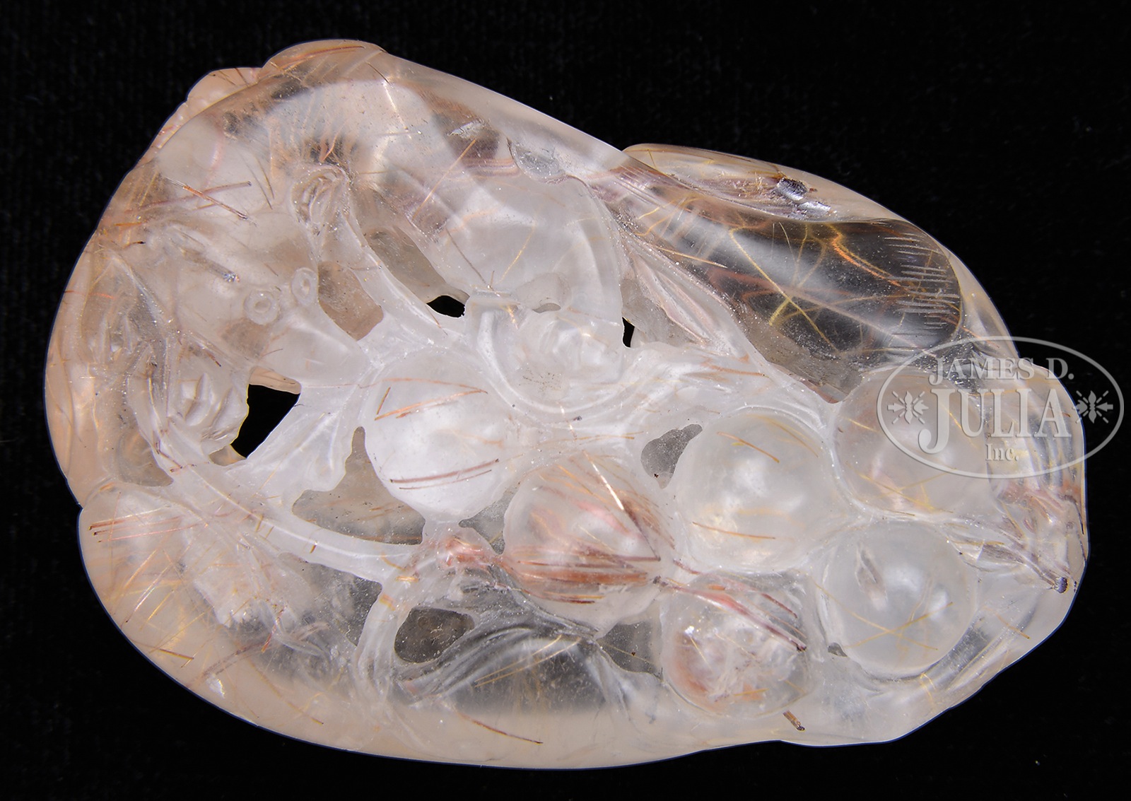 RUTILATED QUARTZ CARVING.China. The carving depicts grapes and peaches, symbolizing fertility, the quartz with good translucency with visible lined inclusions. SIZE: 2″ h x 1-1/4″ w CONDITION: Good. 7-75484 (1,200-1,500) – Lot 2607