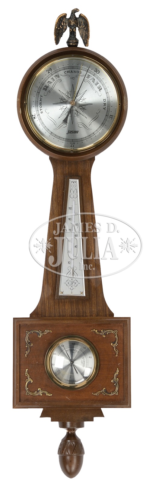ANTIQUE STICK BAROMETER WITH A MODERN EXAMPLE.The stick barometer by “E.G. Wood, London”, thermometer on left hand side of top. The other a “Jason” 20th century wall barometer, having a thermometer and eagle finial. *NOTE-THIS ITEM CANNOT BE SHIPPED AND CAN ONLY BE PICKED UP AT OUR FAIRFIELD MAINE FACILITIES* SIZE: Stick 36″. Wall 32″. CONDITION: First is very good intact, second drop pendant needs securing otherwise good. 49054-7 (400-600) – Lot 2608