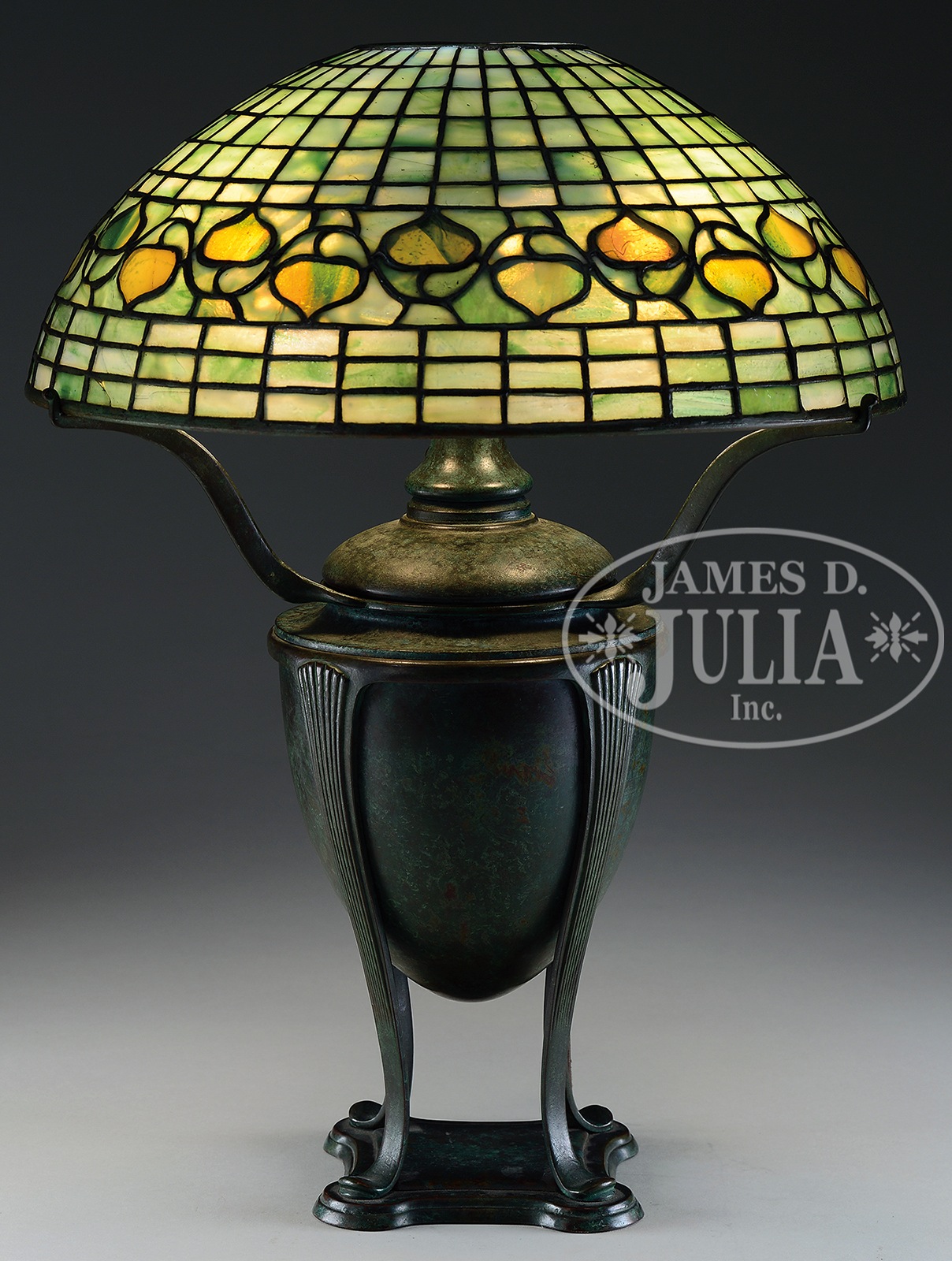 TIFFANY STUDIOS ACORN TABLE LAMP.Tiffany Studios table lamp has leaded glass shade with a band of green and yellow striated acorns encircling the shade set against a heavily mottled green striated background. Shade is signed on interior “Tiffany Studios New York”. Shade rests on a Tiffany Studios urn base with three arm spider. Base has a brown patina with strong grayish green highlights. The oil lamp base has been electrified with a three-socket converter, so nothing has been drilled. Signed on bottom of the oil font “Tiffany Studios New York 4476”. SIZE: Shade is 15-3/4″ dia. Lamp is 21-1/2″ t. CONDITION: Shade is very good to excellent with a few tight hairlines. Base is very good with some minor wear and discoloration to patina. 5-68748 (10,000-15,000) – Lot 2609
