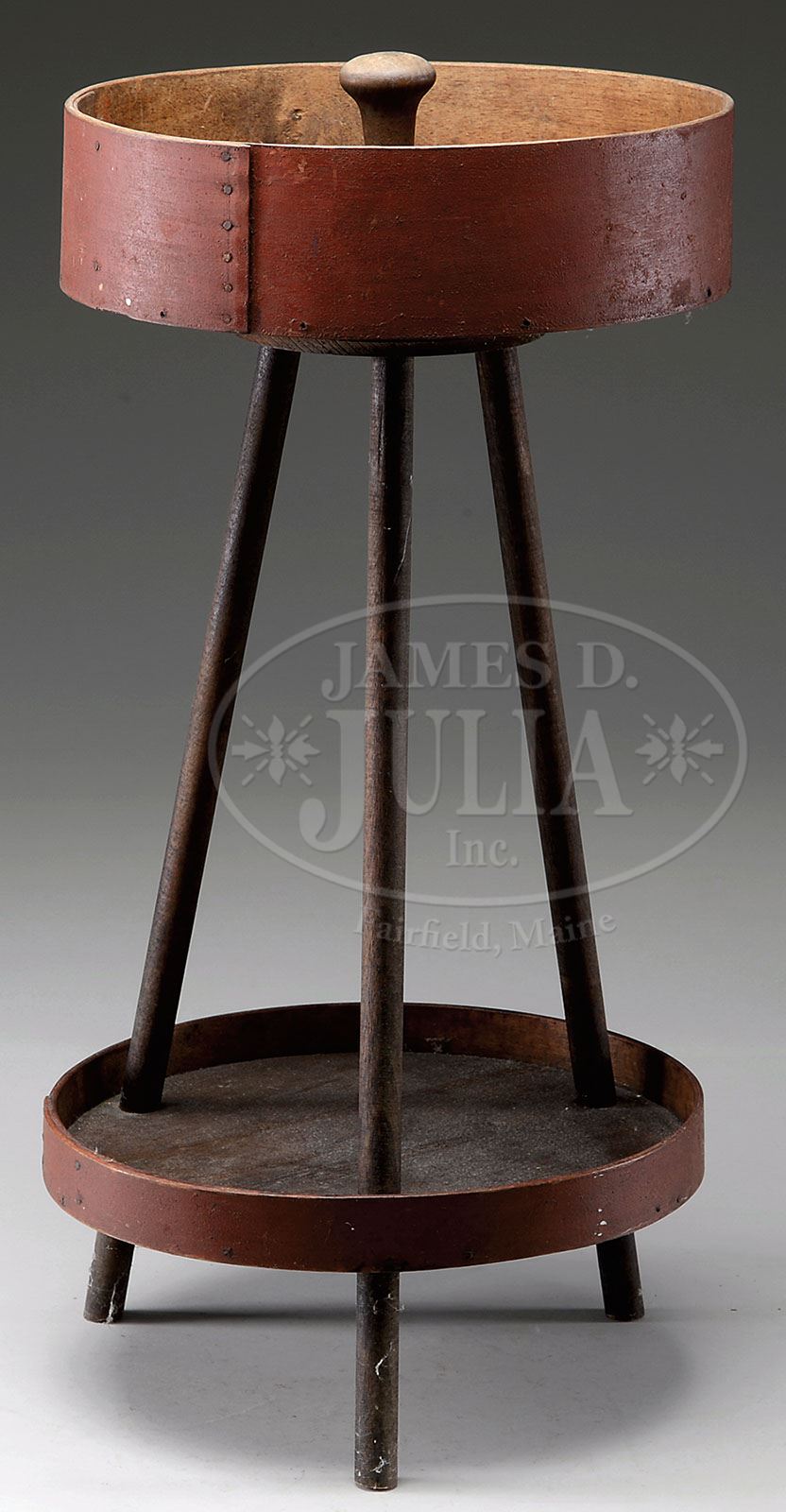 FOLK ART SEWING STAND. 19th century. Made from a red a painted pantry box with cover. Two tiered sewing stand made with square nails and post legs, using red painted pantry box and lid for container and shelf with turned wood center handle. Signed “SS” under top, probably maker’s mark. Possibly Shaker. SIZE: 12″ Diameter – 24″ T. PROVENANCE: This lot was once owned by the pioneer collection of American antiques in the early 1920’s, Julia Sinclair Spring. CONDITION: Very good, original surfaces intact. 9-91699 (1,500-2,500)