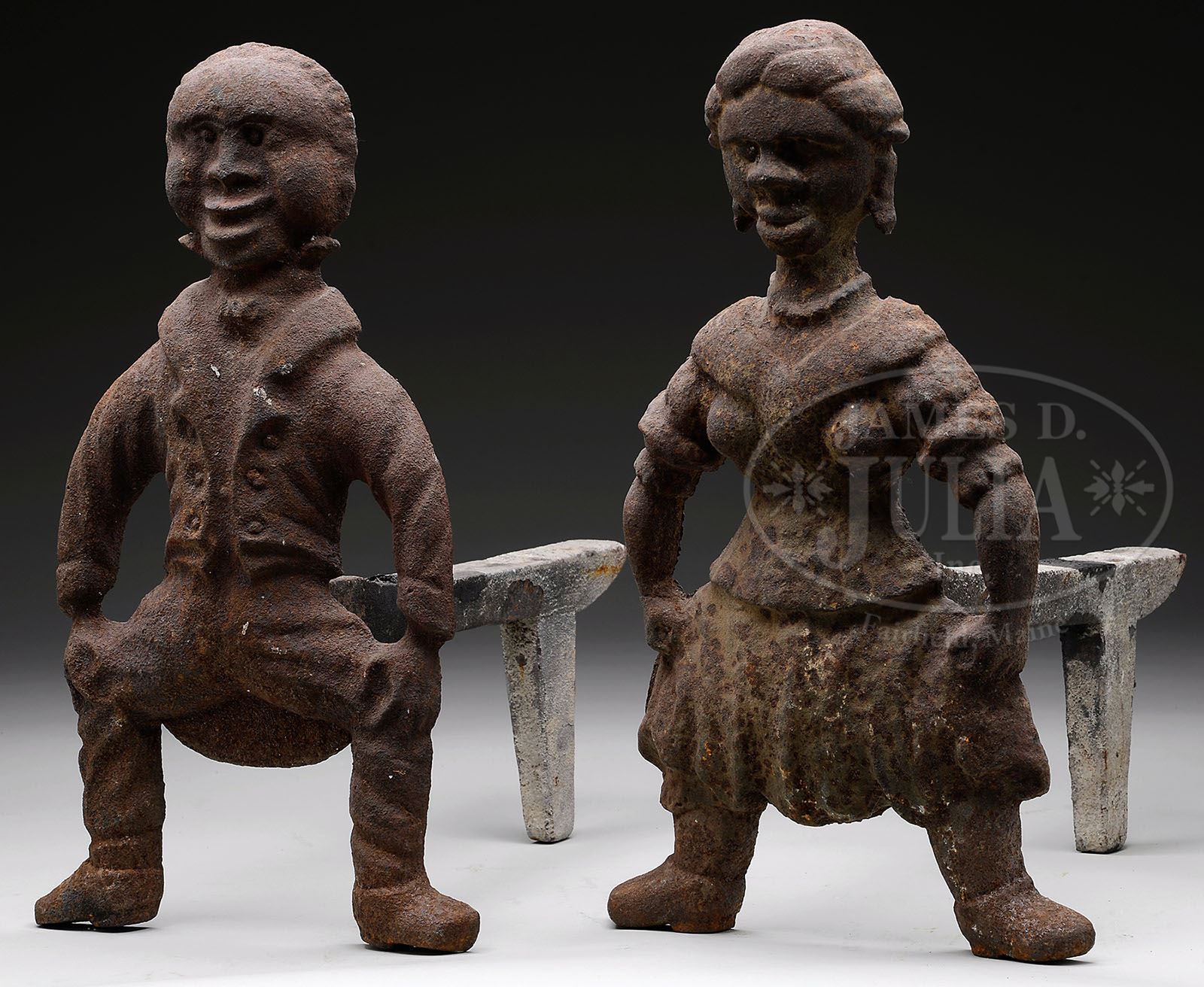 PAIR OF CAST IRON FOLK ART BLACK AMERICANA ANDIRONS. Circa 1870, American. Male and female figures in elaborate attire, having dovetail detachable dogs. SIZE: 17″ T. CONDITION: Pleasant overall rusted surface. 9-92065 (1,000-1,500)
