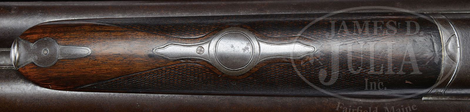 SN 12635. Cal. 8 ga. 33-3/4″ Damascus bbls have flat matted game rib. Bottom of left bbl is marked “C 12635”. Early compensating action with opposed fishhook extractor system and pivoting top lever with sliding bolt, features automatic safety, bushed strikers, pin type cocking indicators, and double triggers. Action has only borderline engraving, and lockplates are marked “LEFEVER ARMS CO”. Trigger plate has a last patent date of ’87. SN is on tang of trigger guard which extends to fluted hard rubber grip cap. Dense, lightly stump figured European walnut capped pistol grip buttstock measures 14-3/8″ over checkered composition buttplate. Point pattern checkering with line borders is at grip. Matching splinter forend with metal tip has push-button release. Bore diameter: left -.840, right -.860. Bore restrictions: left -.105, right -.130. Minimum wall thickness: left -.060, right -.058. Drop at heel: 3-3/4″, drop at comb: 2-1/8″. Weight: 13 lbs 6 oz. LOP: 14-3/8″. CONDITION: Good. Bbls retain traces of orig Damascus finish under considerable oxidation and freckling, some of which could possibly be removed. Action retains traces of orig case hardening color, where protected, but has oxidation similar to that on bbls, and is generally brown patina. Stocks retain a considerable amount of their orig finish, considerably darkened and stained, and with light scratches, rubs, and marks, a few a bit heavier. Checkering at grip is lightly worn. Forend checkering is considerably worn from normal carrying wear. Lock and tang screws show use and peaning. There is a small chip at front portion of grip cap. Bores are fair, fairly shiny, but with considerable pitting throughout. Action is tight, and bbls on face with opening lever held in battery. Spring is a bit weak and will not fully activate lever, so bbls feel loose. A new spring should put this right. Large bore Lefevers are extremely rare.   4-54008 (6,000-10,000) – Lot 2613