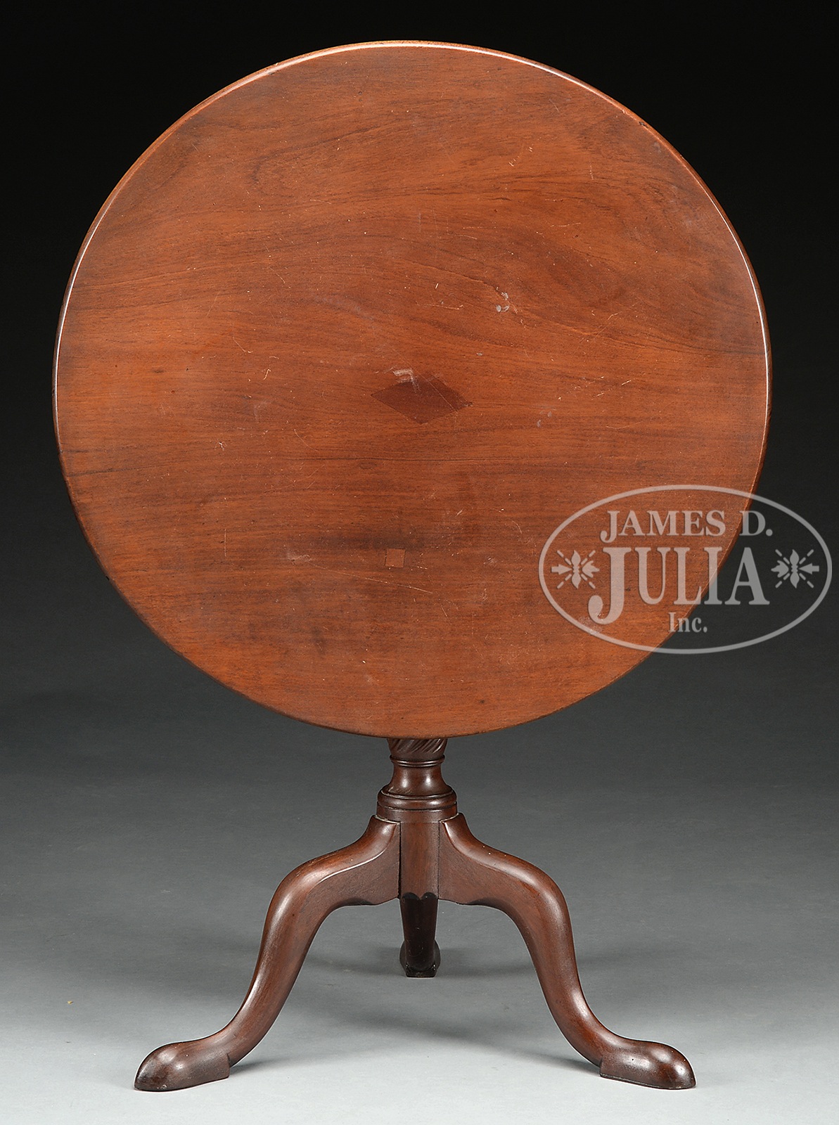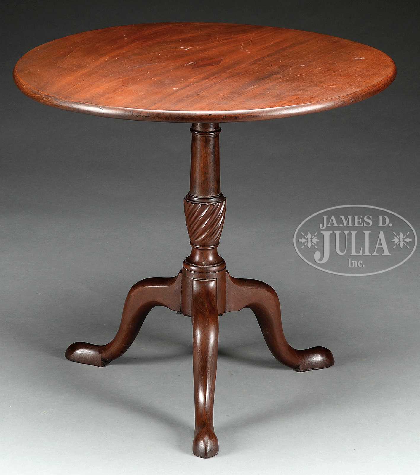 QUEEN ANNE MAHOGANY TILE TOP TEA TABLE.New England last quarter 18th century. The circular top hinged and tilting on a ring-turned pedestal with spiraltwist urn joined to a cabriole leg tripod base terminating in pointed platform pad feet. SIZE: 27-3/4″ h x 29-3/4″ d x 29-1/4″ d. PROVENANCE: Central Connecticut private collection. CONDITION: Central diamond patch in top and smaller square old patch repair to block support at hinge, retains old re-polished and cleaned surface. 50068-10 (700-900) – Lot 2619