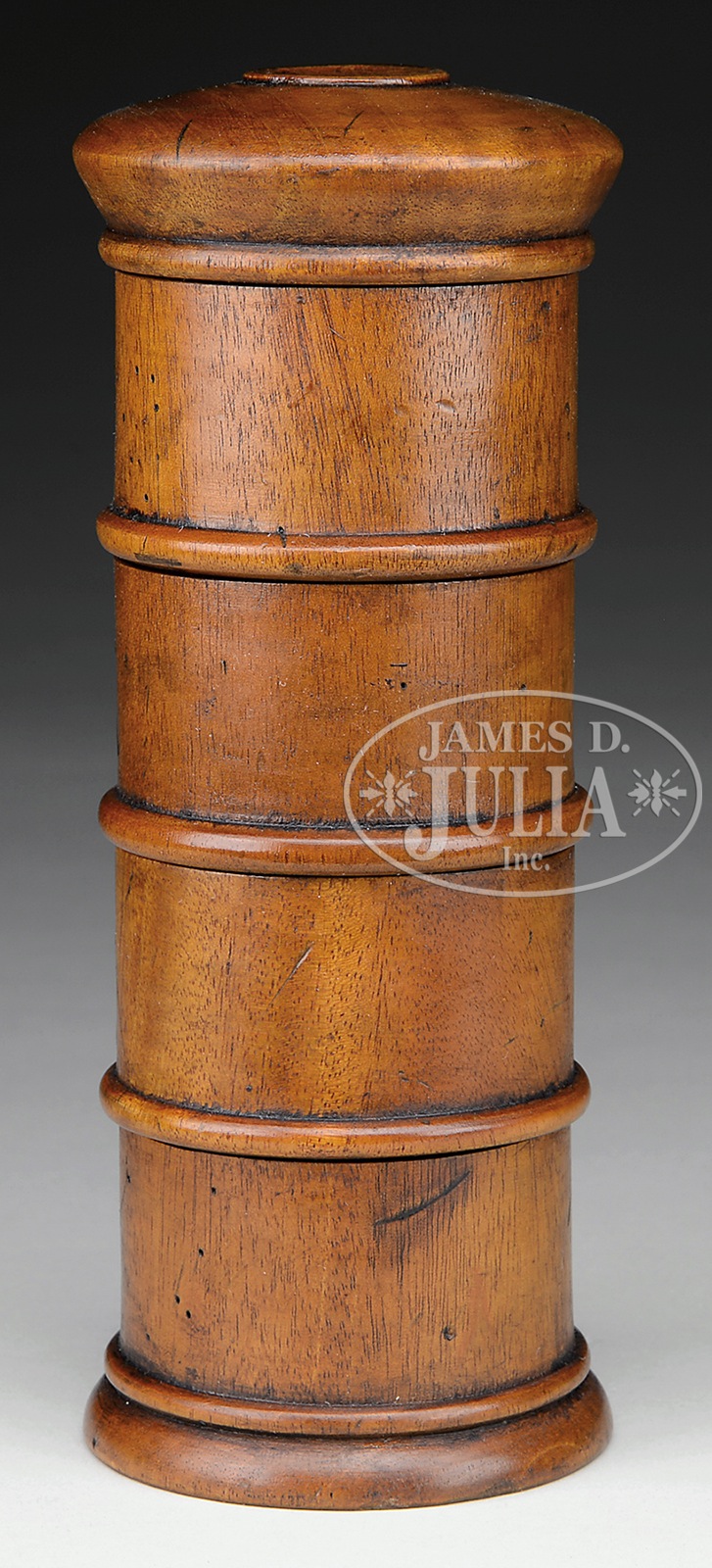 TREEN STACKING SPICE HOLDER.In 5 sections, including lid. Each section marked with lithograph label denoting specific spice. Each turn section with locking mechanism to keep contents from spilling. SIZE: 8″ h x 3″ diameter. CONDITION: Very good. Clean. 9-93799 (200-300) – Lot 2620