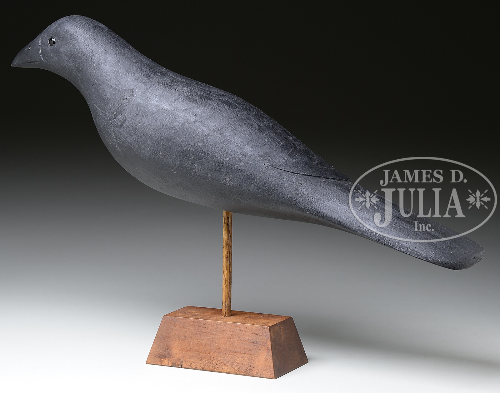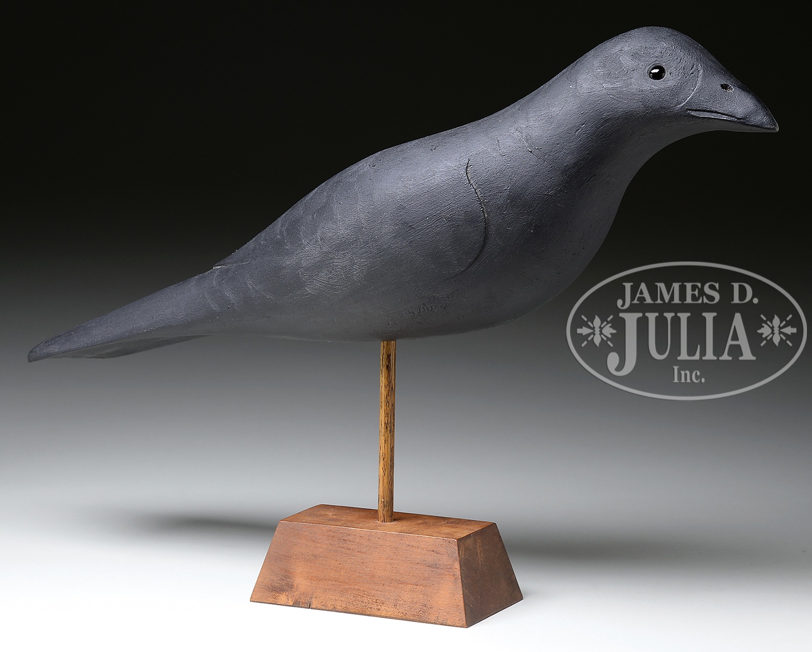 FRANK FINNEY CARVED CROW.American 21st century. Stylized carving from one piece of pine with glass eyes. Signed on bottom. Mounted on wooden display stand. SIZE: 23″ l x 5″ d 14-1/2″ h on stand. CONDITION: Good. 49240-9 (1,000-1,500) – Lot 2620