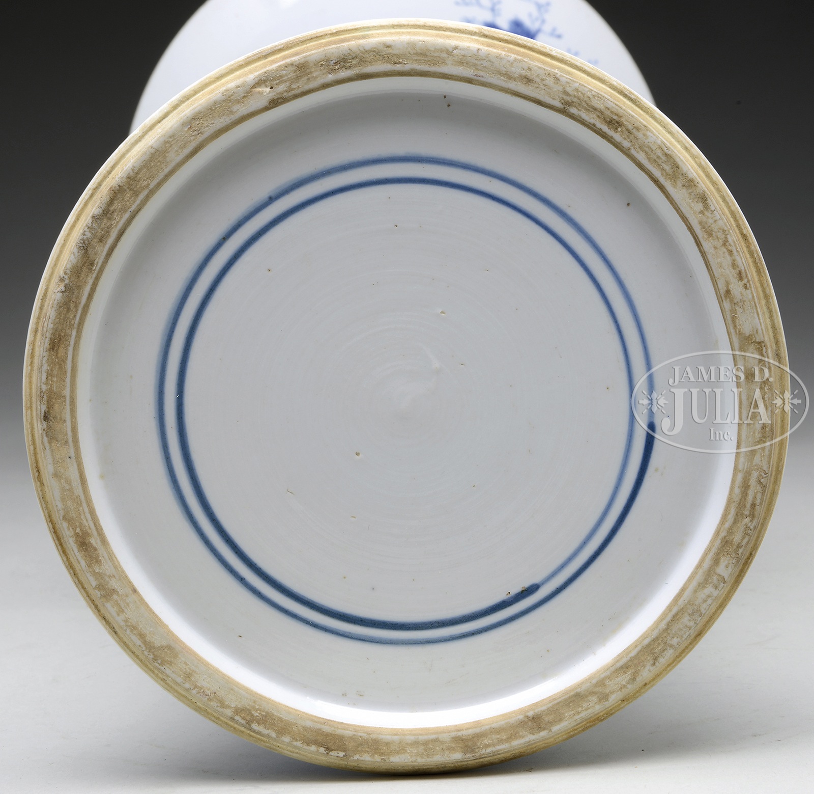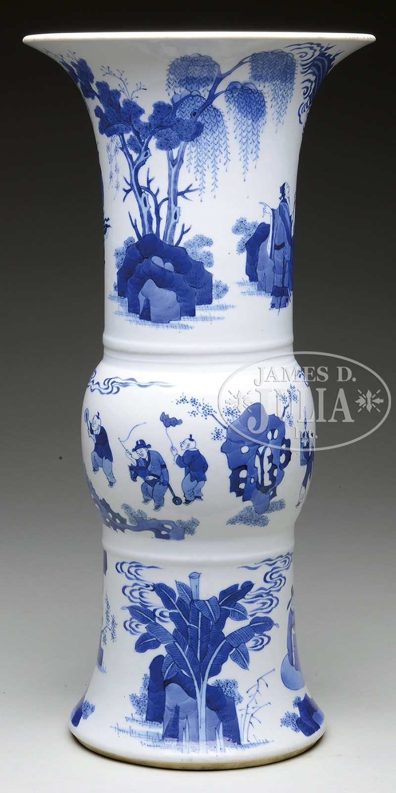 BLUE AND WHITE FLOWER VASE, GU.China, 20th c. The vase has flaring rim and splayed round feet, the body painted with people in outside setting engaged in different activities, bottom with double blue ring. SIZE: 18-1/4″ h CONDITION: Good. 7-75538 (600-800) – Lot 2623