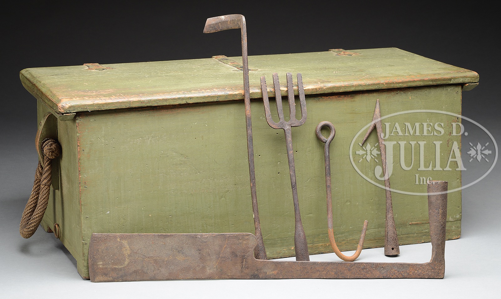ANTIQUE SEA CHEST IN GREEN PAINT.Nailed construction with decorative hand wrought outside hinges, fine antique beckets, open interior. Partial contents includes, a large 28″ fro signed Dalaway, a shipwrights draw shave 21″, and 3 other pieces. SIZE: 14-1/2″ h x 37″ w (widest) x 15-1/2″ d. CONDITION: Very good, some scratches and scuffs. 49190-10 (400-600) – Lot 2626