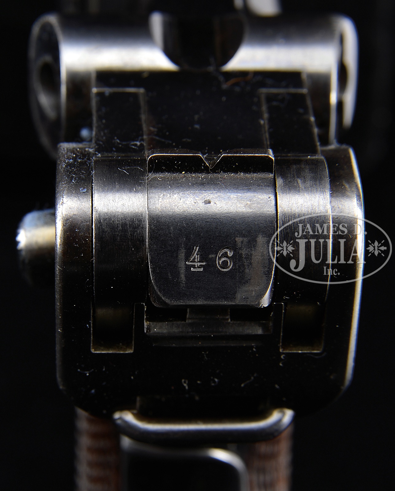 *◊ IMPORTANT DWM DUTCH TRIALS PROTOTYPE LUGER SERIAL NUMBER 10046B.SN 10046B. 4″ 7.65 mm Cal bbl of the distinctive prototype light military pattern with ramped foresight. DWM scroll on center toggle link. Dished toggles with toggle latch. Unmarked safety area. Grip safety. Unnumbered wood bottom magazine. All numbered parts are matching down to the checkered walnut grips. This is possibly the first surviving short frame prototype, which was converted from a long frame and is mechanically identical to the Dutch 1904 trials pistols, of which it is probably the internal factory prototype. This gun is featured on pp. 99, 101, 223, 225, 229 and 264 of The Borchardt & Luger Automatic Pistols by Joachim Gortz & Dr. Geoffrey Sturgess. PROVENANCE: Collection of Dr. Geoffrey Sturgess. CONDITION: Excellent. Retaining about 90% blue with silvering on sharp edges. Scattered scratches and fading on grip straps. Retains about 70% straw, some having been reheated. Bore is bright with light wear. Dark grips show some wood grain and have some dings and chips in the checkering. Magazine is excellent with very little wear. Mechanics are excellent. 43475-497 (10,000-12,000) – Lot 2626