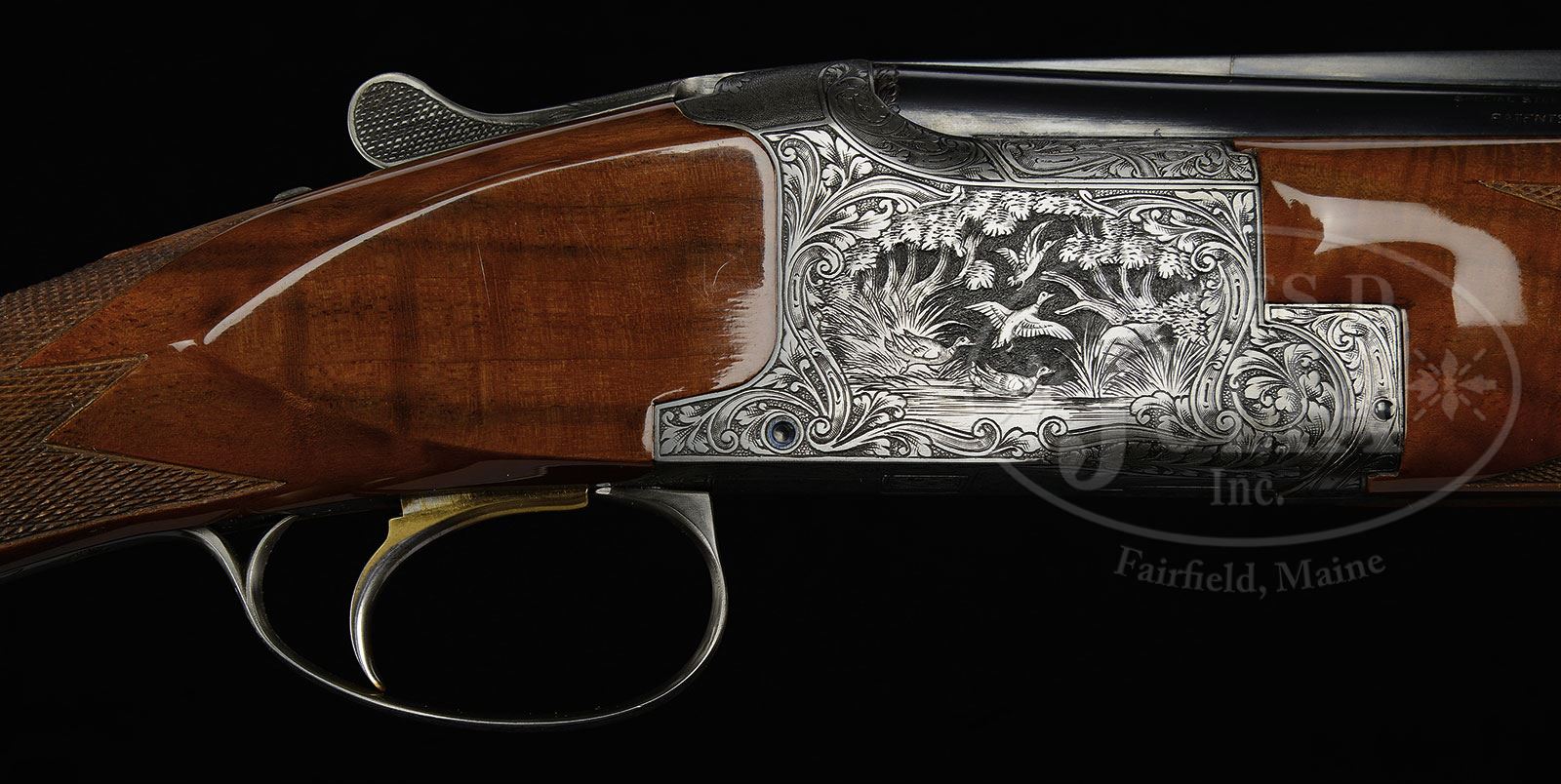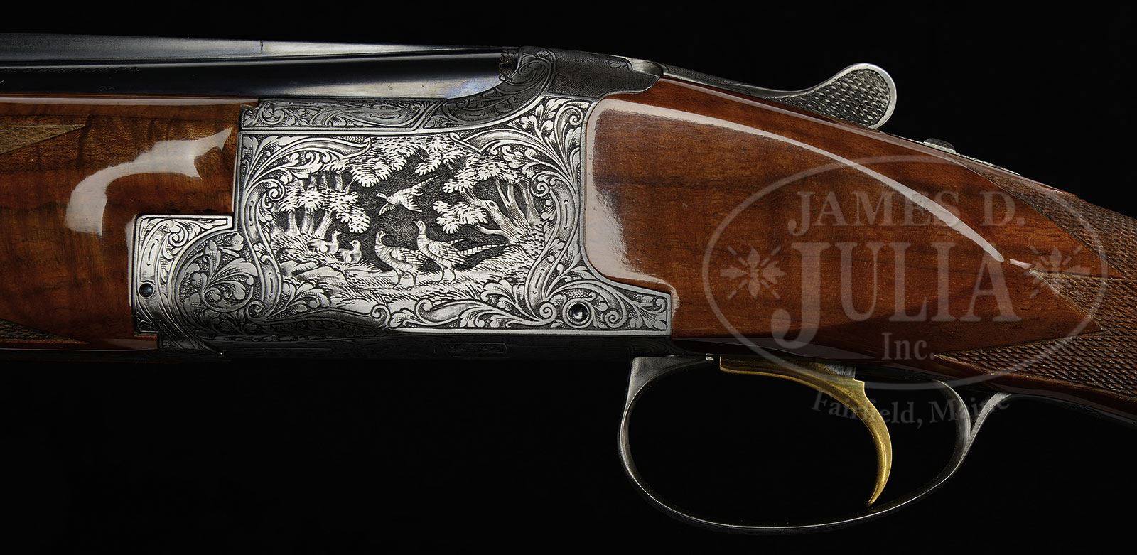 Please note: It appears that the checkering has been recut and does not have the typical border seen on these guns. *20 GAUGE BROWNING SUPERPOSED DIANA GRADE WITH CASE.SN 40209V6. (1966 pre salt) Cal. 20 ga. 3″ Chambers. 28″ Bbls are marked for IC and modified. Browning name with MO and Montreal addresses over “MADE IN BELGIUM” are on left, and “SPECIAL STEEL” with chamber and gauge information over patent numbers are on right. Typical coin finished Superposed action is fitted with single selective gold-plated trigger. Action is engraved with large semi-relief scrolled shaded acanthus through strap work outlining semi-relief vignettes of game birds; five pheasants in woodlands on left, and four ducks, one swimming, one walking, and two flushing, on right. A pair of quail fly across bottom of action and a pair of rabbits are on trigger guard bow. This very well detailed engraving is unsigned. Nicely flame figured claro walnut long tang round knob buttstock measures 14-1/4″ over Browning composition buttplate. Point pattern checkering is at grip. Field style forend matches well. Drop at heel: 2-5/16″, drop at comb: 1-1/2″. Weight: 6 lbs. 8 oz. LOP: 14-1/4″. Tan vinyl Browning case is lined in beige faux fur, and contains key. CONDITION: Excellent, near new, retaining nearly all its factory finishes on wood and metal, with a few extremely light handling marks in wood. Mechanically crisp. Case is excellent, with a few light marks. Interior shows compressions and soiling from contact with gun and bbls. 4-47947 (5,000-7,000) – Lot 2630