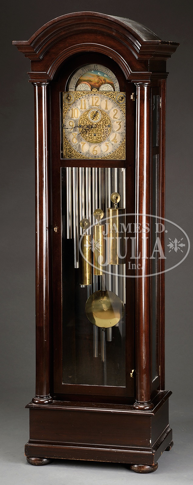 MAHOGANY TALL CLOCK WITH ELABORATE 13 TUBE, CHIME MOVEMENT.First quarter 20th century German. Patented March 27th, 1917 U.S.A. Fitted with a very elaborate movement, having 13 tube, chime (full octave). Movement offering quarter hour chime variations and a different chiming score for each day of the week, Notre Dame, St. Paul, Carillon, Westminster, Trinity, St. James, Auld Lang Syne. Movement driven by three weights and having large pendulum. Engraved brass dial having second hand and moon phases with dial controls chime and silent and type of chime. The mechanism was designed by Charles Jacques. Marked on dial “Baden”. Case design number on back of clock is “540”. Mahogany case with beveled glass front and sides. NOTE: Clock is accompanied by maintenance records. SIZE: 89″ t X 25″ w X 18″ d. PROVENANCE: Purchased from George Borgfeldt Co., N.Y. by Charles L. Hartmann. Sold to Raymond Gosselin in 1968 by Helen Hartmann Corridon, now to current owner. CONDITION: Very good. 7-70719 (2,000-4,000) – Lot 2636