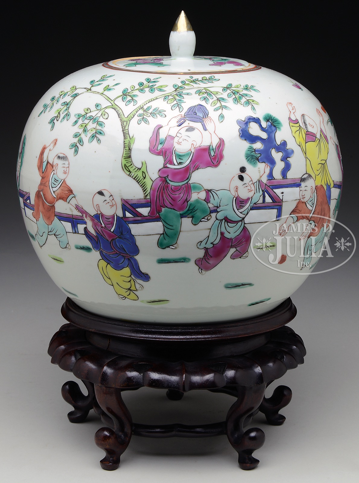 FAMILLE ROSE COVERED JAR WITH STAND.China, 20th c. Of globular form, the covered jar depicts children playing in garden setting, includes carved wooden stand. SIZE: 8″ h x 8-1/2″ d CONDITION: Good. 7-75559 (200-300) – Lot 2637