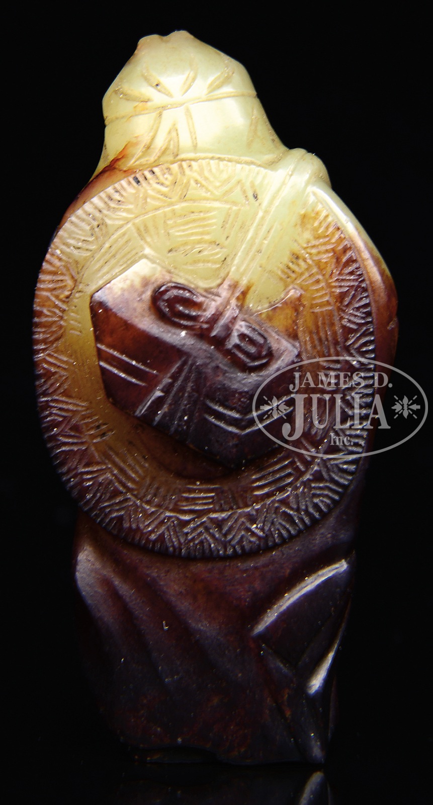 JADE CARVING OF BODHIDHARMA.China. The carving depicts the Bodhidharma standing with a strawhat and a box on the back, the stone of celadon with russet. SIZE: 1-1/2″ h CONDITION: Good. 7-75485 (1,200-1,500) – Lot 2644