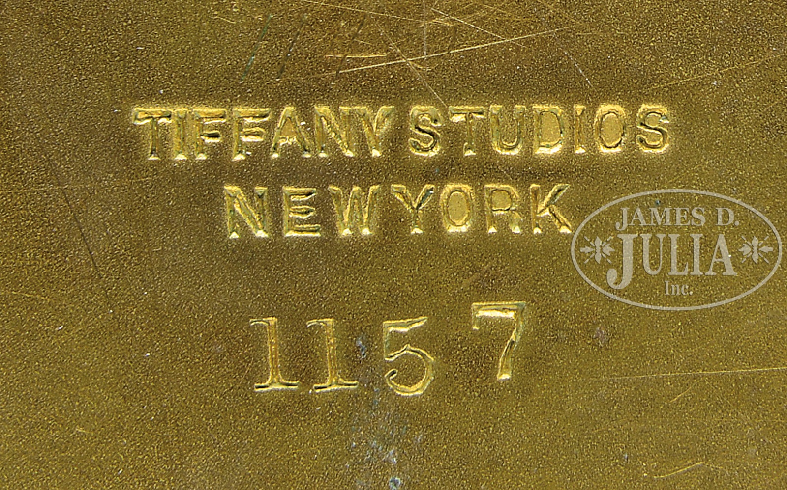 THREE-PIECE TIFFANY STUDIOS ABALONE DESK SET.Tiffany Studios abalone desk set has gold patina and inset with abalone disks. Set consists of an octagonal inkwell, stamp box, and paper knife. Each piece is stamped “Tiffany Studios New York” and numbered. SIZE: Inkwell is 3-3/4″ sq. Stamp box is 2-1/8″ x 4″. Knife is 9-3/4″ l. CONDITION: Very good with some wear to patina, primarily on letter knife. 5-67903 (900-1,200) – Lot 2647