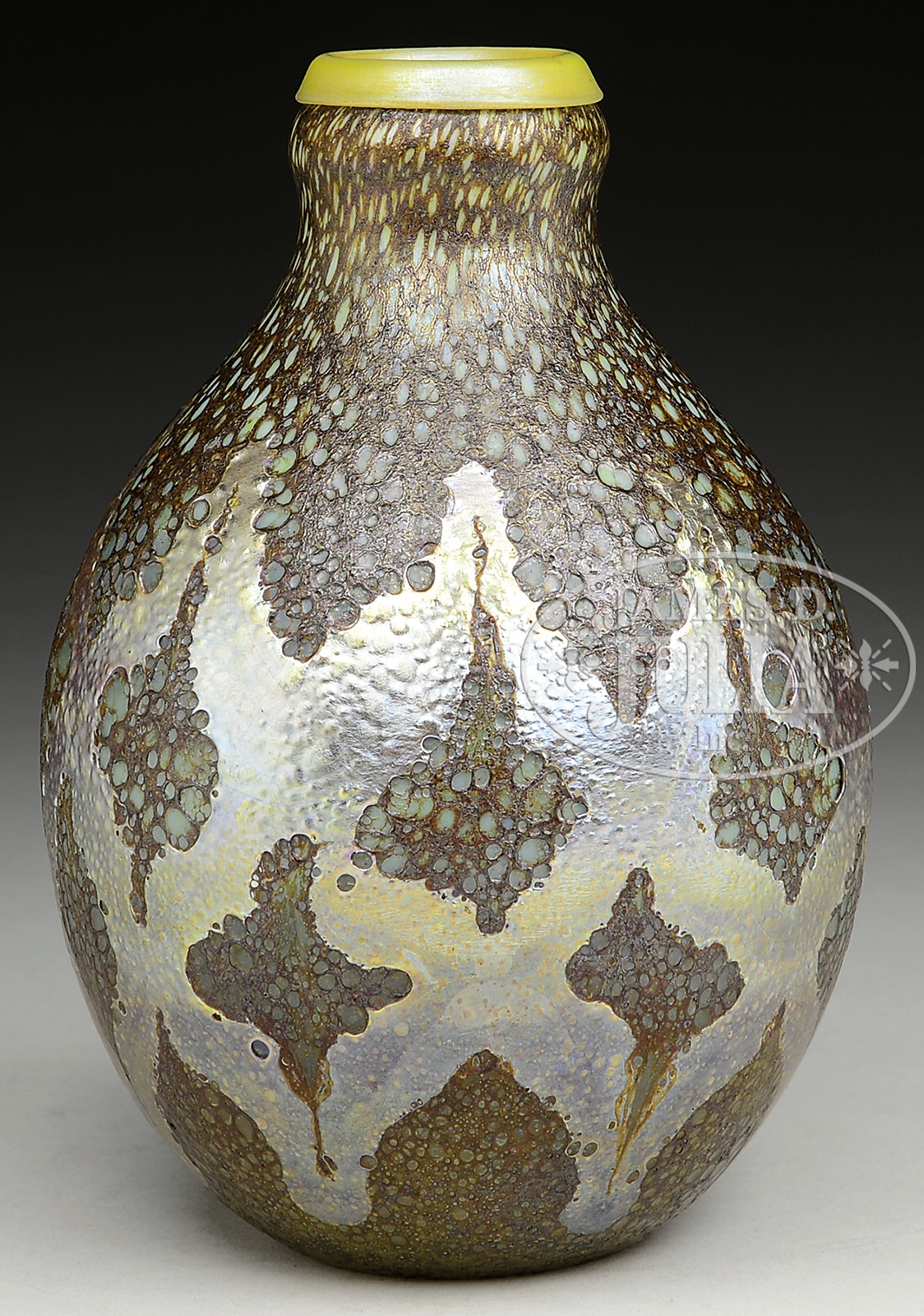 TIFFANY CYPRIOT VASE.Tiffany vase has Cypriot finish against a green opalescent body. Vase is further decorated with criss-crossing bands of gold iridescence with strong platinum highlights. Vase is finished with an applied yellow, lightly opalescent, lip. Signed on the underside “L.C.T. N2823″ along with an original Tiffany Glass & Decorating Co. paper label. SIZE: 6-1/2” t. CONDITION: Very good to excellent. 5-69003 (8,000-12,000) – Lot 2661