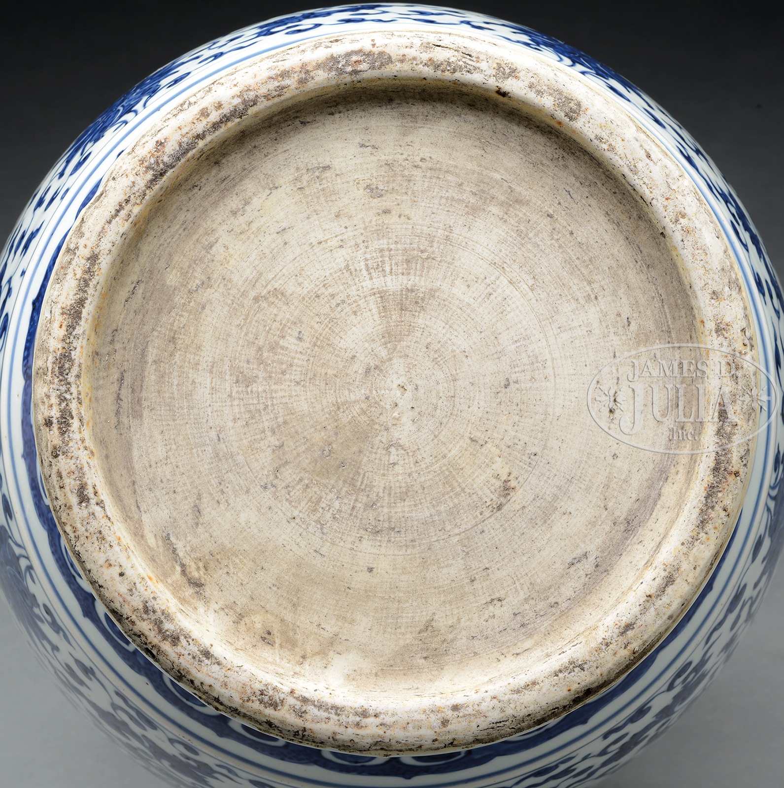 LARGE BLUE AND WHITE LOTUS VASE.China, 19th Century. The large blue and vase is of baluster form, the body painted with lotus and vine patterns, with two handles on the side. SIZE: 23-1/4″ h CONDITION: Some wear and chip. 9-96807 (1,500-2,500) – Lot 2664