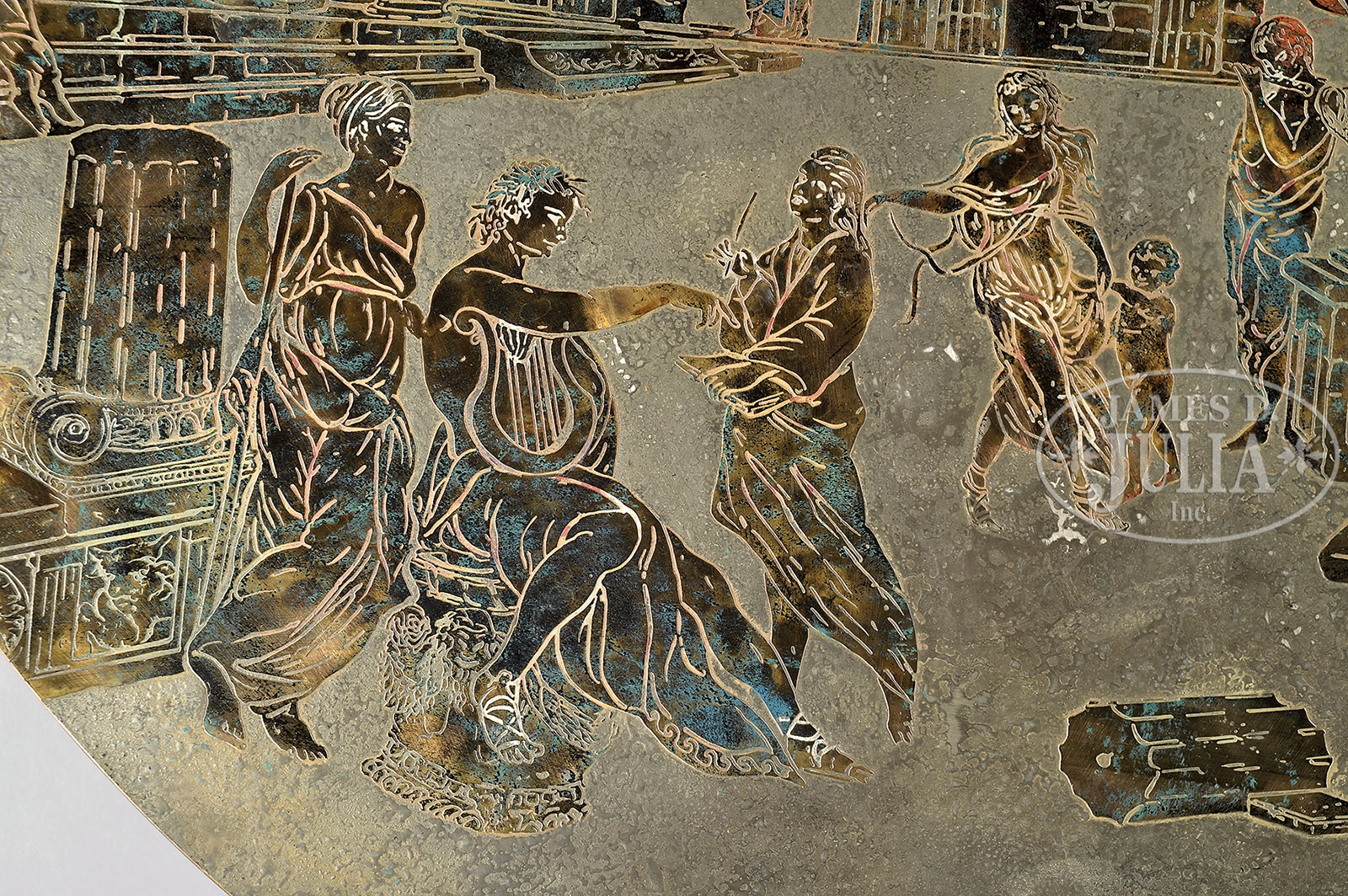 PHILIP AND KELVIN LAVERNE MID CENTURY MODERN “ODYSSEY” COFFEE TABLE.New York 1960s with acid etched top. Decorated with classical Greek scene featuring musicians, scholars and building facades with classical columns and caryatids. The base of fluted form in patinated brass. The father and son team of Philip and Kelvin Laverne worked in New York as artist furniture makers specializing in one of a kind and limited edition pieces. SIZE: 17″ h x 47″ diameter. CONDITION: Very good. Slight wear and minor scratch on the top. 9-93596 (3,000-5,000) – Lot 2665