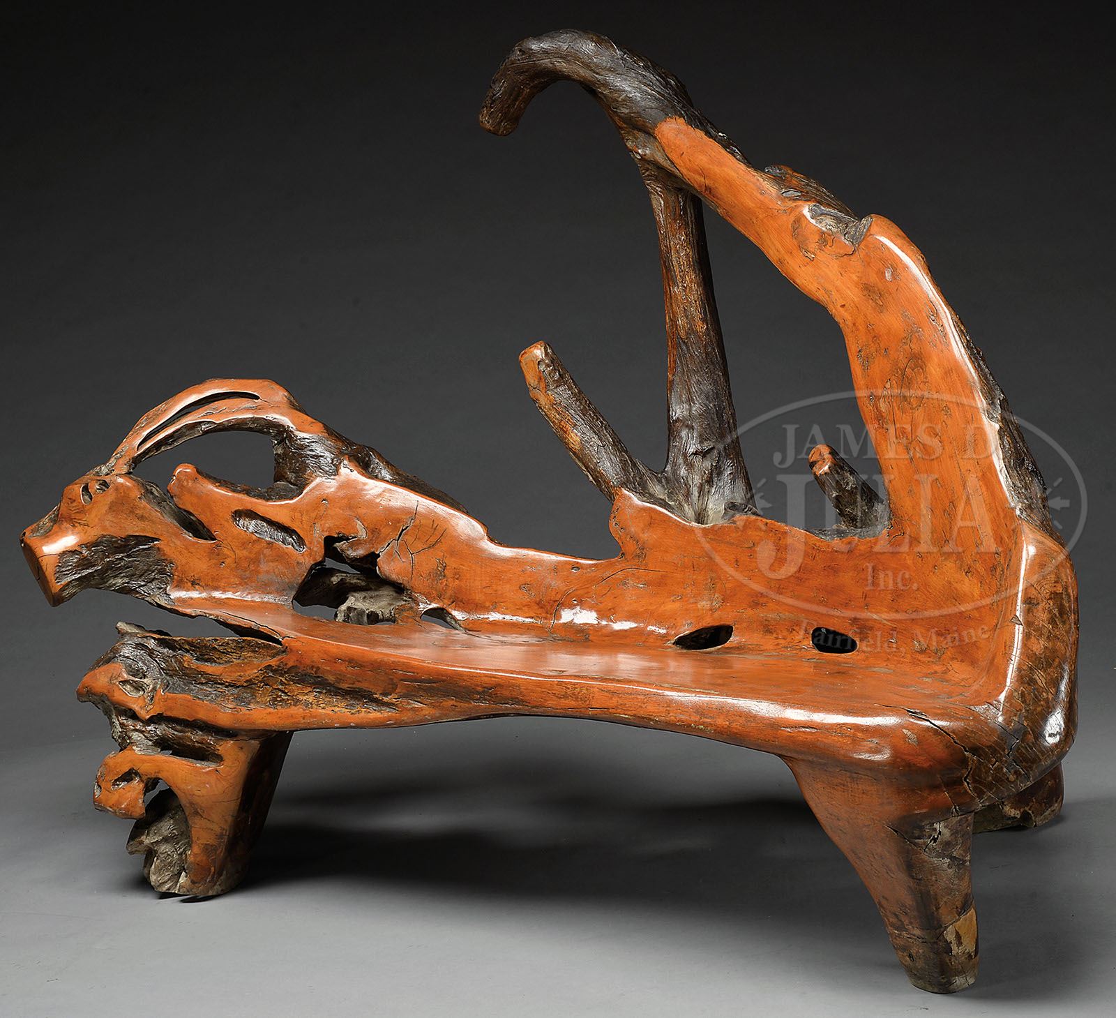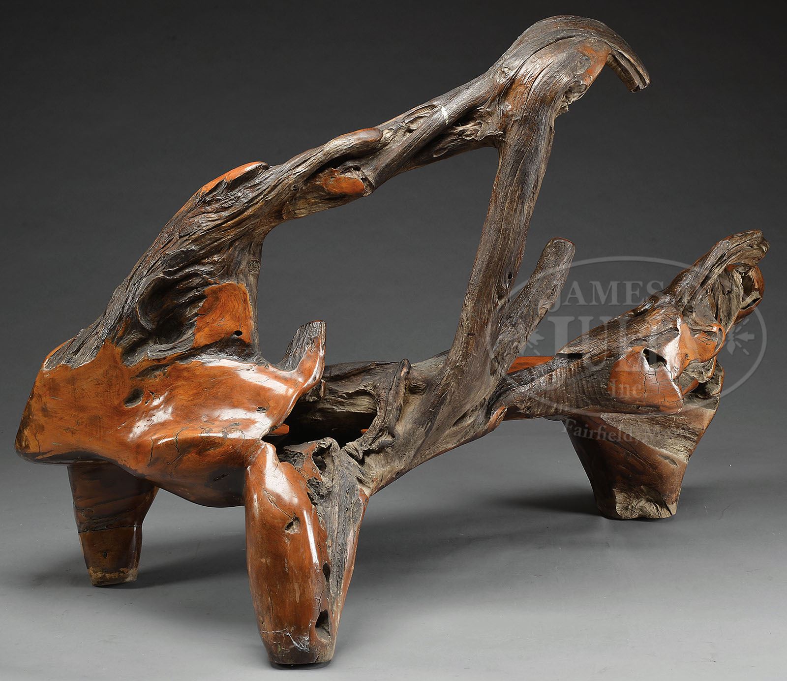 LARGE CARVED RUSTIC ROOT BENCH. Large high back bench with three legs carved from an elaborate root. Probably redwood. SIZE: 70″w x 33″d x 50″h. CONDITION: Very good with nice old patina. 9-92499 (1,800-3,600)