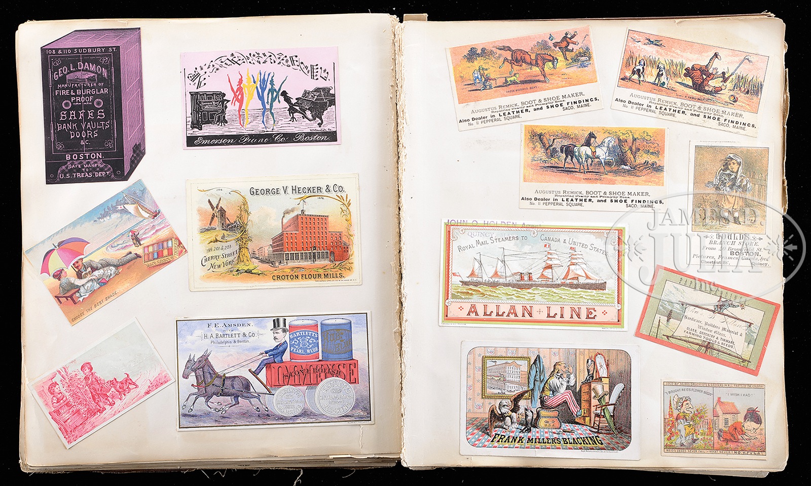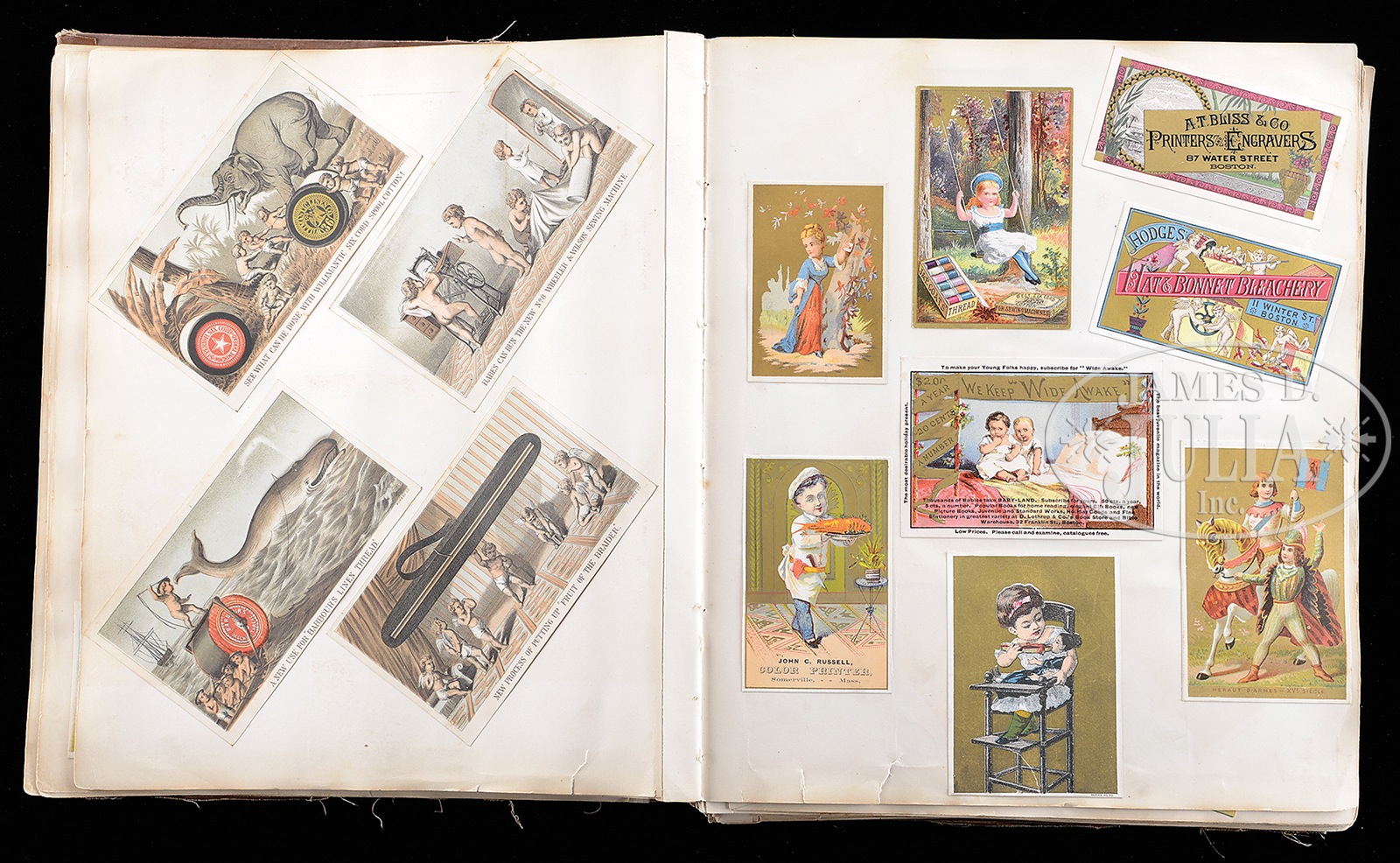 ALBUM WITH LARGE QUANTITY OF TRADE CARDS.Accumulated in 1881, Quincy Massachusetts. Bound volume, interior page inscribed “Willie Frank Sidelinger, Quincy Point Mass. Nov. 2nd 1881.” With approximately 150 pages completely filled with trade cards and holiday cards including black Americana, Kate Greenaway, sets, nautical, animals etc. SIZE: 14″ x 11-1/2″ CONDITION: Pages very good with minor foxing, wear to edges, end boards intact but rough, spine missing. 7-74842 (200-300) – Lot 2677