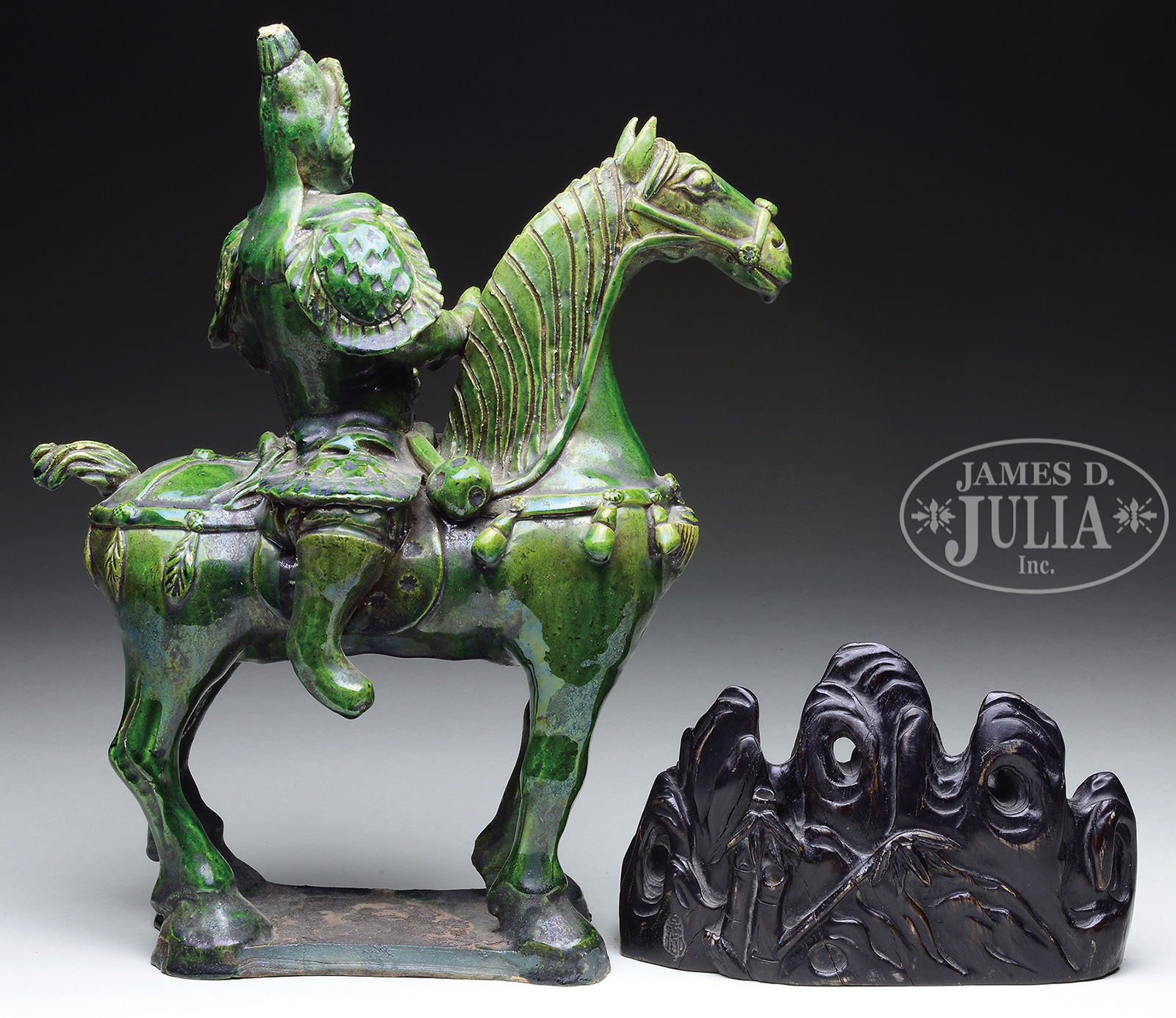 LOT OF TWO DECORATIVE ITEMS.Late 19th to early 20th century, China. Lot includes a pottery figure of a warrior on a horse covered with a thick deep green glaze, together with a paperweight shaped as a mountain with deer and pine trees. SIZE: 13″ l x 10″ w and 7″ l x 4-3/4″ w, respectively. CONDITION: Very good. 7-75691 (100-150) – Lot 2684