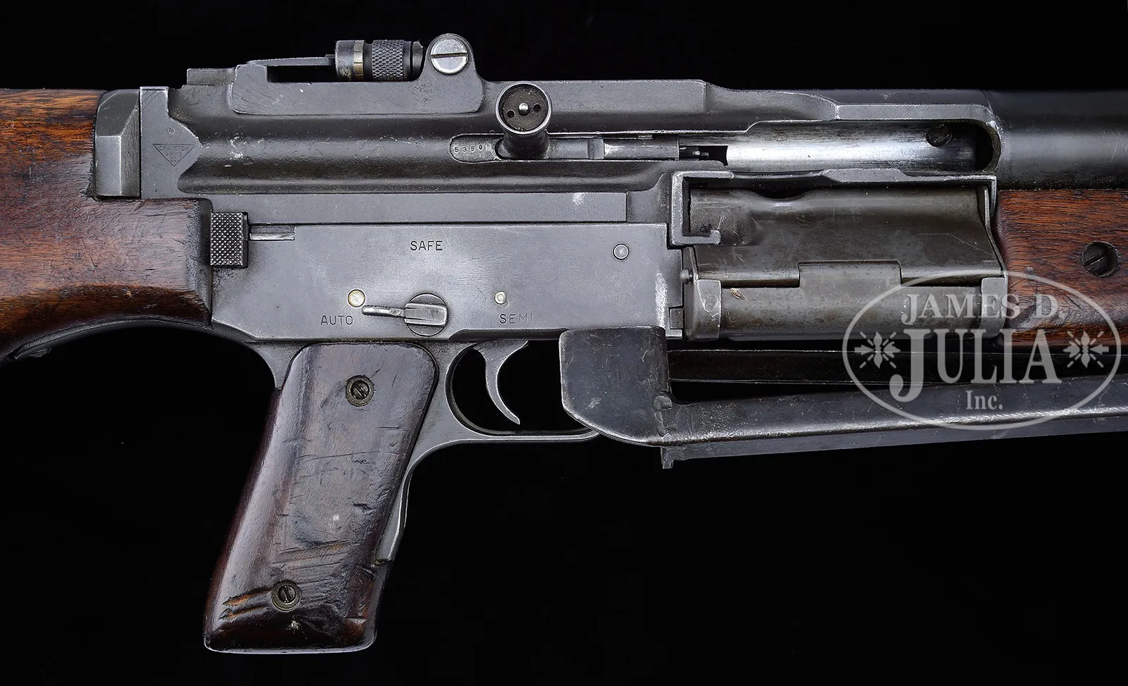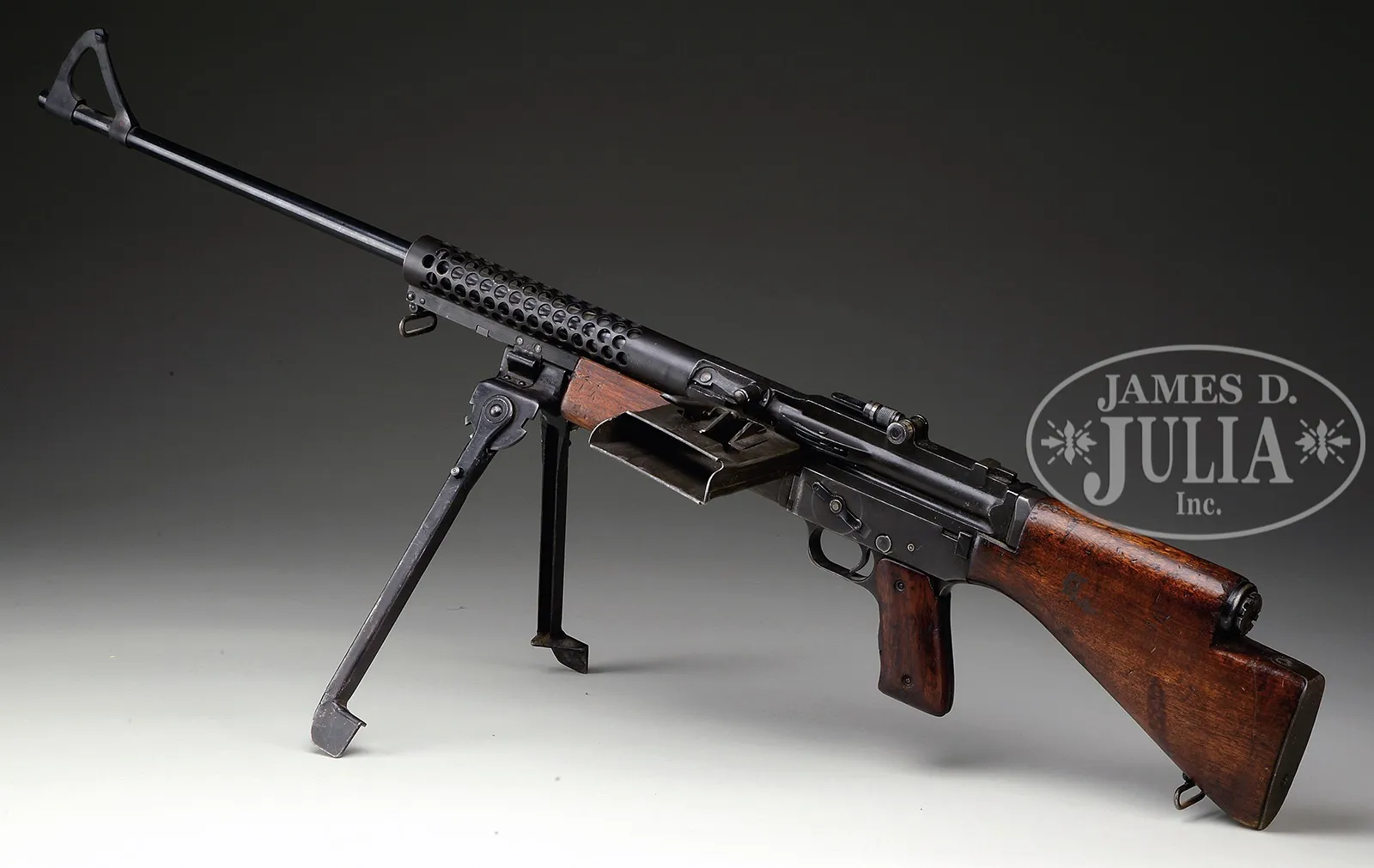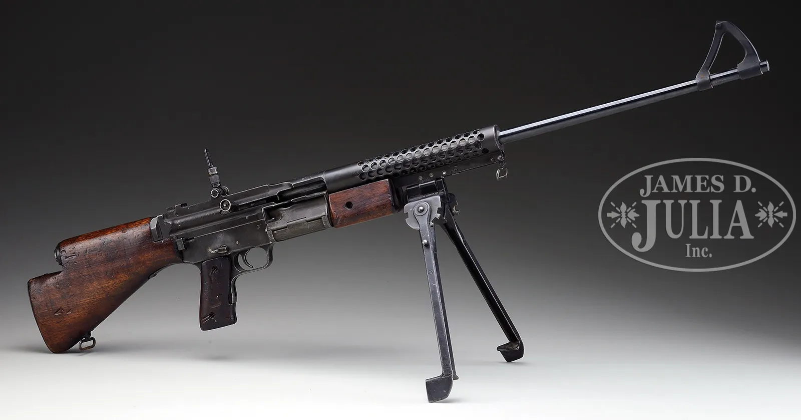 **SOUGHT AFTER JOHNSON MODEL 1941 LIGHT MACHINE GUN (C & R).SN 0360. Cal. 30-06. 22″ bbl. Fine orig specimen of the Johnson 1941 light machine gun. . No magazine present. This weapon is marked with patent dates and “JOHNSON AUTOMATICS” information on top of receiver above ejection port includes its orig attached bipod. Marked on right side of receiver “CRANSTON ARMS CO” within an inverted triangle. Bottom of magazine housing is marked “2-NE-42” indicating this was supplied in 1942 by New England Arms as a sub-contractor. Front of bbl is marked “30-06” and “41”. Bolt is SN C5350. Bbl reciprocating spring has good tension. Bi-pod deploys properly. Mechanism functions smoothly when operated by hand. This gun appears fully functional. This is a National Firearms Act item and requires BATF approval prior to transfer. This item is fully transferable on an ATF Form 3 or a Form 4. PROVENANCE: The class III weapons formerly on loan to Evergreen Aviation & Space Museum. CONDITION: Overall appearance & finish is fine with typical dings and scratches as one would expect from a combat used weapon. Finish is thinning in places but a great deal of the orig grey/green finish remains on all metal parts. Bbl has more of a high lustrous blue finish. Forend pistol grip and buttstock have numerous dings, bruises & small gouges but no cracks and are quite strong & serviceable. Bolt is appropriately tight within receiver and spring tensions are good. Both face is fine. Bore is brilliant, shiny and clean. These Johnson LMGs were used with distinction by the Marine Corps in the Pacific theater and decent specimens like this one are highly sought after. 49651-8 JWK19 C&R (20,000-25,000) – Lot 2685