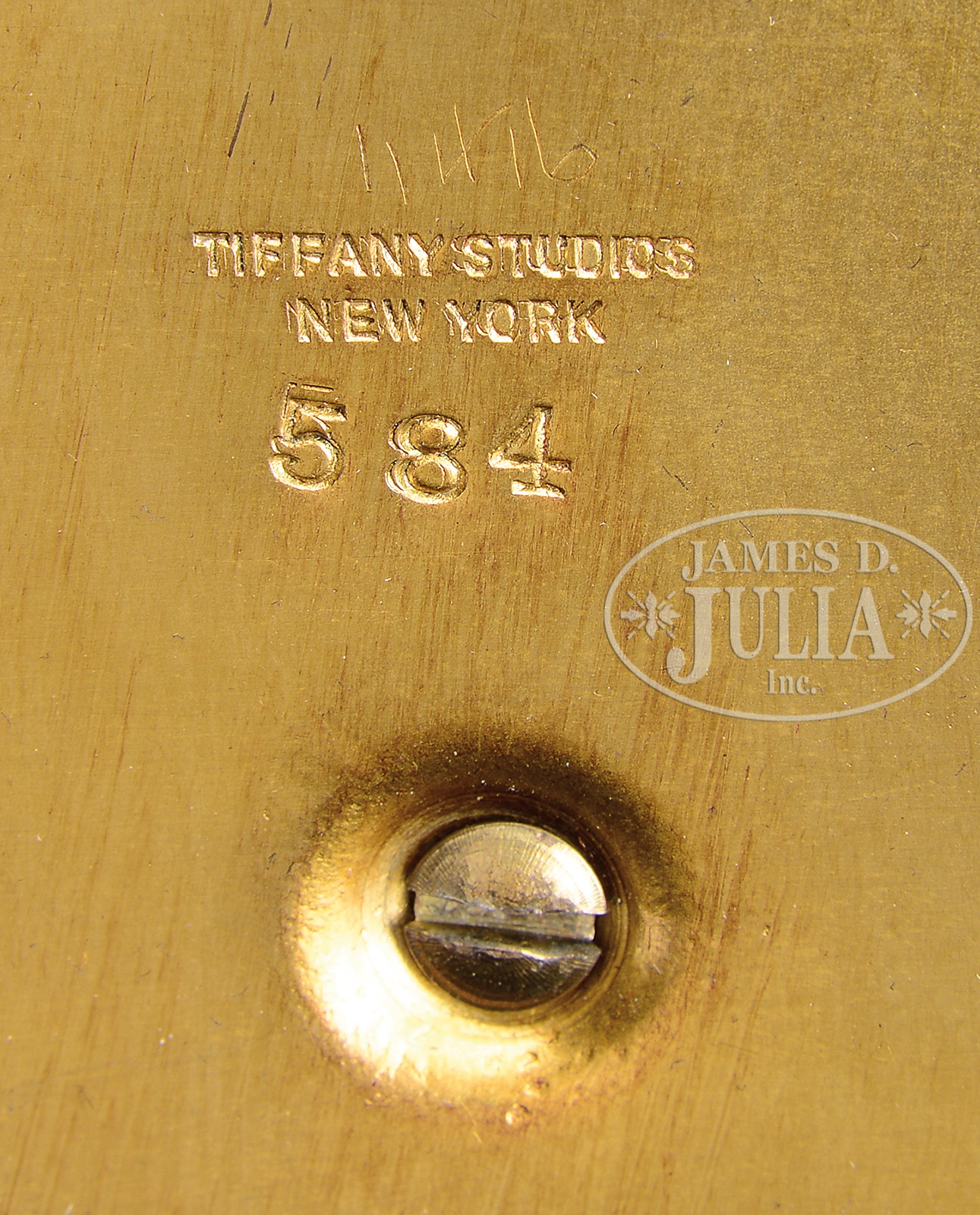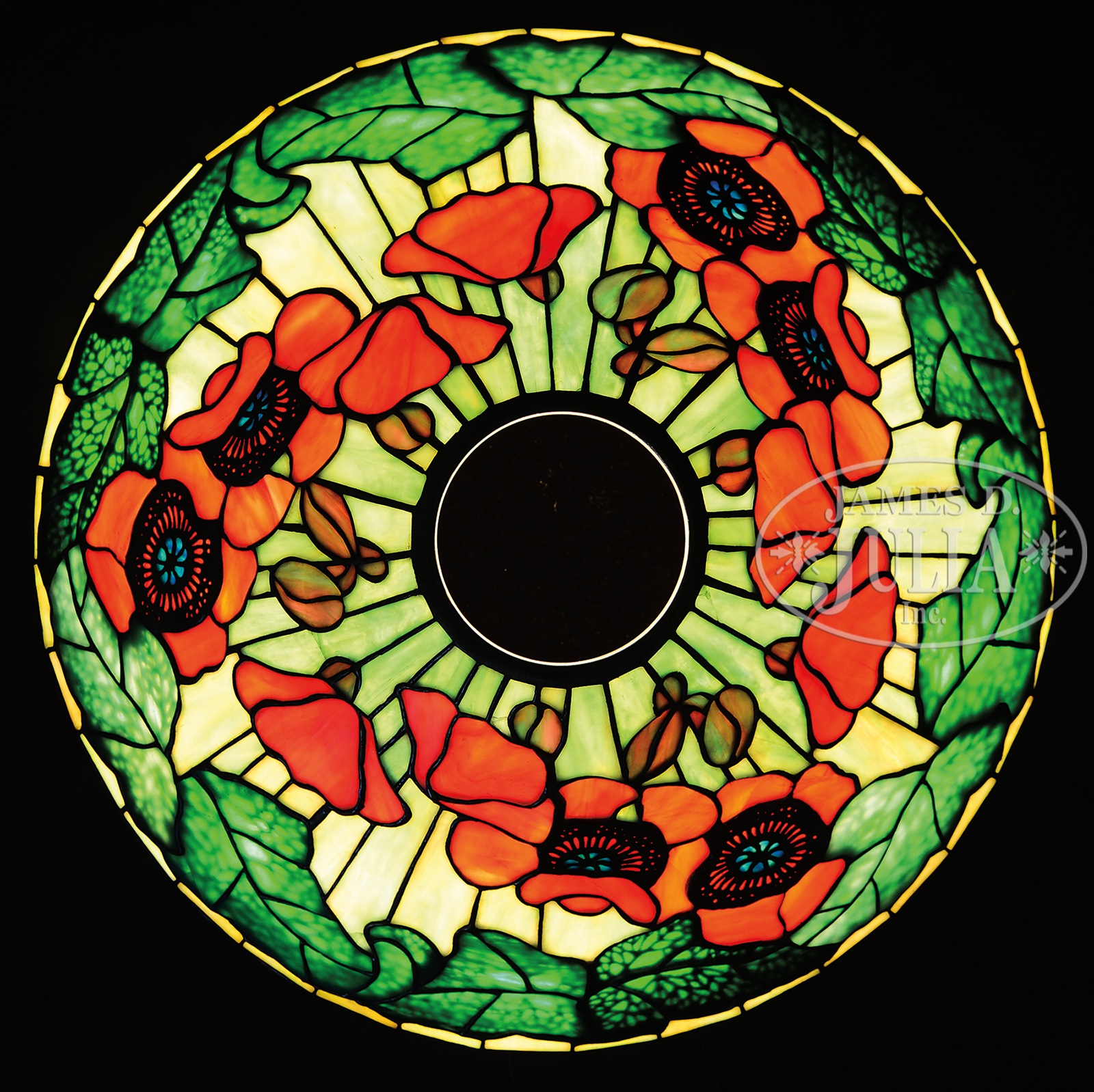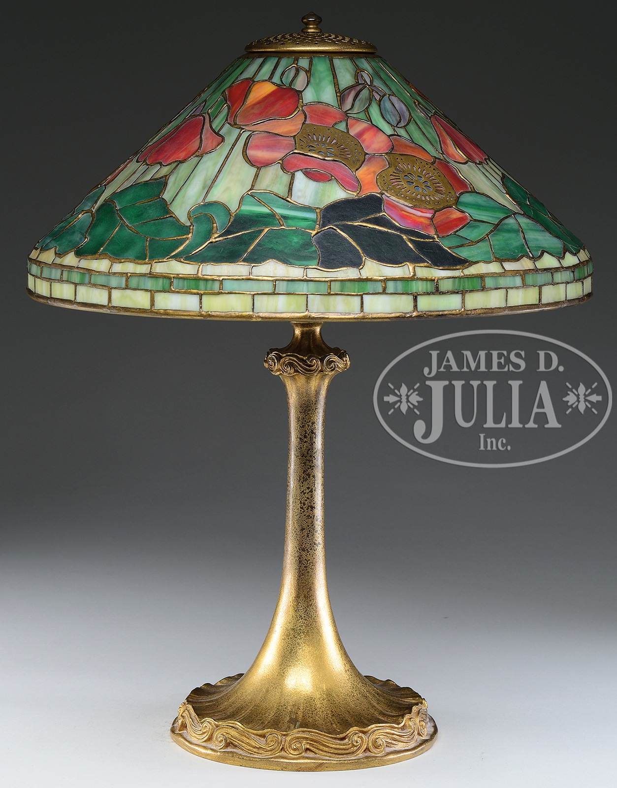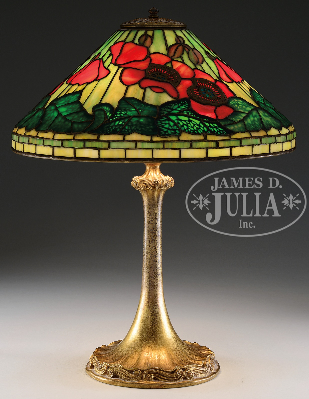 TIFFANY STUDIOS POPPY TABLE LAMP.Tiffany Studios poppy table lamp has orange poppies with green leaves encircling the edge of the shade, all set against a striated green background. Shade is further decorated with applied bronze poppy centers on the exterior and applied bronze leaf veins on the interior giving the leaves a 3-dimensional feel when lit. Shade is signed on the lip “Tiffany Studios N.Y. 1461”. Shade rests on a Tiffany Studios base with scrolled decoration surrounding the foot and top of stem. Base is complete with a three-socket cluster and is topped with pierced heat cap. Base is finished in gold dore and signed on the underside “Tiffany Studios New York 584”. SIZE: Shade is 16-1/2″ dia. Lamp is 21-1/2″ t. CONDITION: Very good to excellent. 5-68864 (35,000-45,000) – Lot 2705