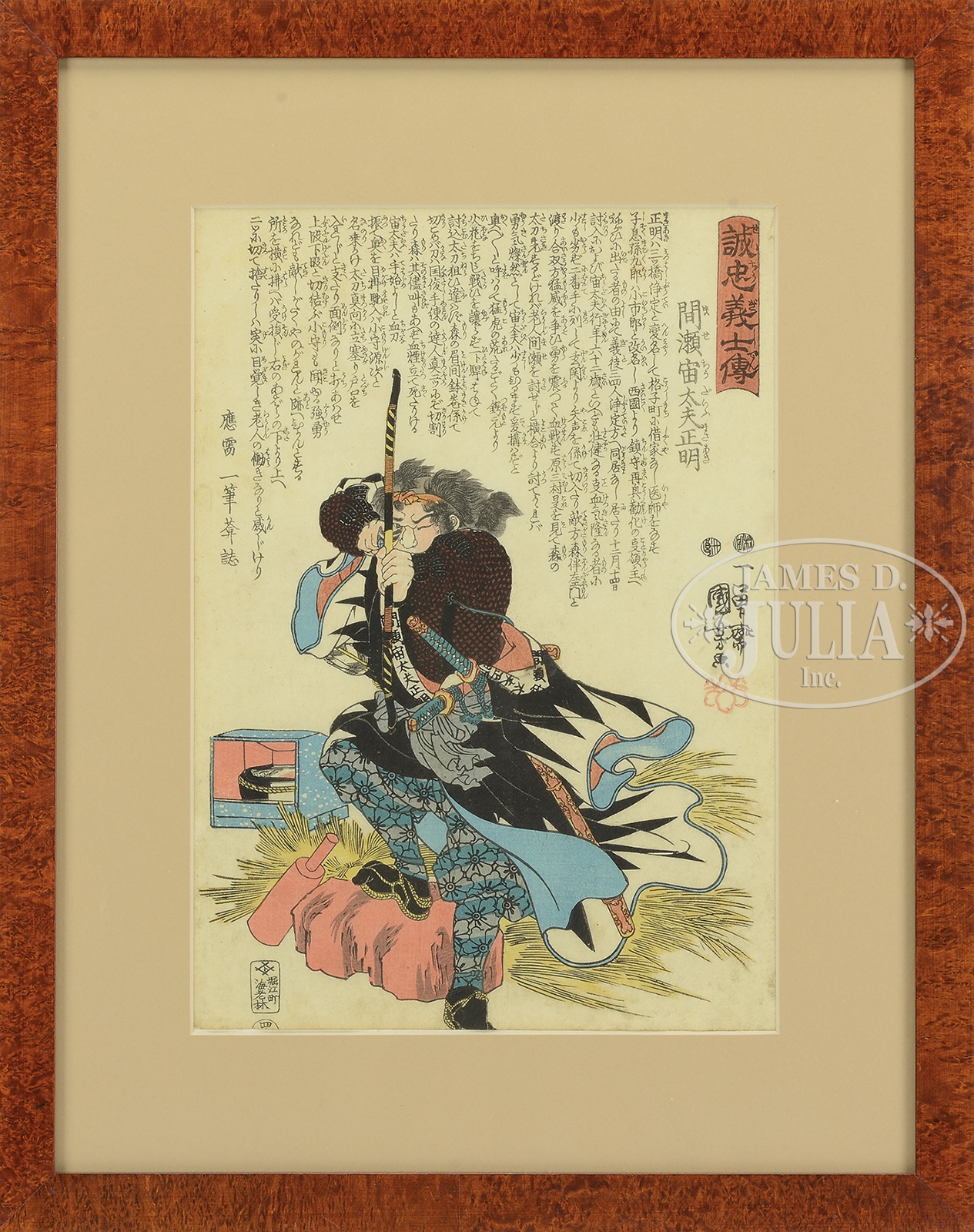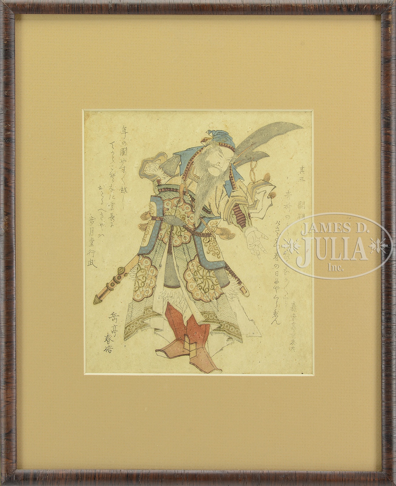 FOUR JAPANESE WOODBLOCK PRINTS SAMURAI AND MILITARY.1) 1st half 19th century. Woodblock print of a Samurai with colorful armor and verse, by Kuniyoshi. 2) Woodblock print of the Chinese God of war in full regalia with weapons, by the artist Gakutei, nicely framed and matted. 3) Woodblock print of Mase Chudayu Masaaki aiming an arrow at the viewer, from the series “Stories of the True Loyalty of the Faithful Samurai” by the artist Kuniyoshi, published by Ediya Rinnosuke, nicely framed and matted. 4) Woodblock print of an elderly Samurai from the Suikoden series, illustrating episodes from the Shui Hu Chuan, by the artist Kuniyoshi, nicely framed and matted. SIZE: 1) Oban tate-e. Block size 14″ x 9-1/4″, 35.56cm x 23.50cm. 2) Surimono tate-e. Block size 7-3/4″ x 6-3/4″, 19.69cm x 17.15cm. 3) ōban tate-e. Block size 13-1/2″ x 9-1/2″, 34.29cm x 24.13cm. 4) Oban tate-e. Block size 14″ x 9-1/4″, 35.56cm x 23.50cm. PROVENANCE: From a Maine collection. CONDITION: 1) Small amount of edge loss, minor stains. 2) Slightly darkened otherwise very good, margins unavailable for observation, not examined without frame. 3) Very good with a small amount of stain around the edges, margins unavailable for observation, not examined without frame. 4) Uneven staining to background, some worm damage, apparent paper decay, margins unavailable for observation, not examined without frame. 9-94612, 9-94617, 9-94613, 9-94661 (100-200) – Lot 2707