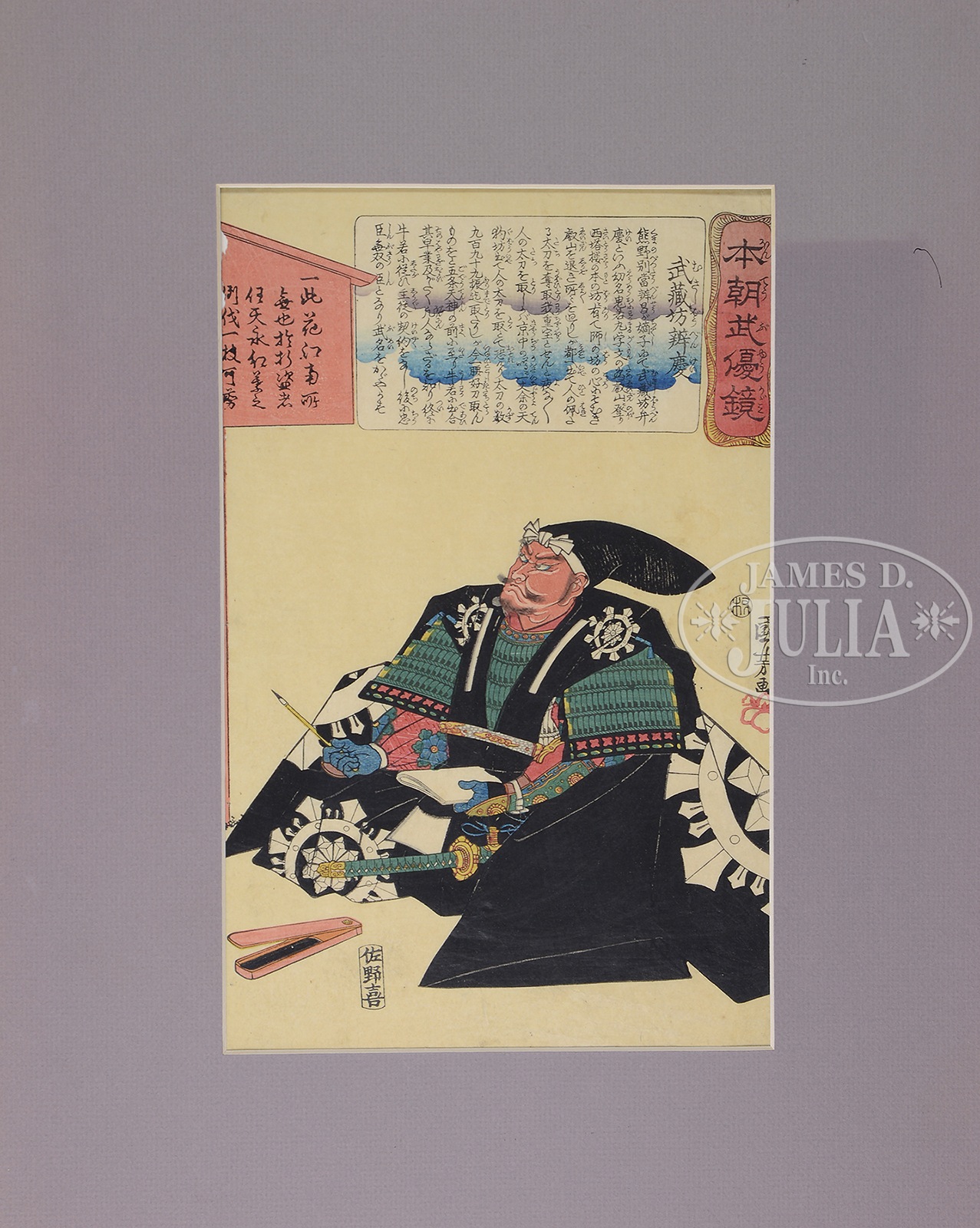 FOUR JAPANESE WOODBLOCK PRINTS DEPICTING SAMURAI.1) 1st half 19th century. Depicting a Samurai and his lady with full regalia, by Kunisada, nicely framed and matted. 2) Depicting Samurai with paper and calligraphy brush in full regalia, by the artist Kuniyoshi, unframed. 3) Seated Samurai with flowing robes, by the artist Kuniyoshi, unframed. 4) View of Moronao given the option of Seppuku from the series “Chushingura-Loyal League of the 47 Ronin”, by the artist Toyokuni (Kunisada), unframed, printed in 1844. SIZE: 1) Surimono tate-e. Block size 7-3/4″ x 7″, 19.69cm x 17.78cm. 2) ōban tate-e. Block size 14″ x 9″, 35.56cm x 22.86cm. 3) ōban tate-e. Block size 14″ x 9″, 35.56cm x 22.86cm. 4) ōban. Block size 9″ x 13-3/4″, 22.86cm x 34.93cm. PROVENANCE: From a Maine collection. CONDITION: 1) Very good with minor staining, margins unavailable to be observed, not examined with out frame. 2) Minor background stains and slight losses to edges. 3) Very good with slight discoloration, repaired loss on left edge and small loss to upper right corner. 4) Very good, margins intact, minor fold upper left corner, bright and clean image. 9-94614, 9-680, 9-94634, 9-94633 (200-300) – Lot 2708