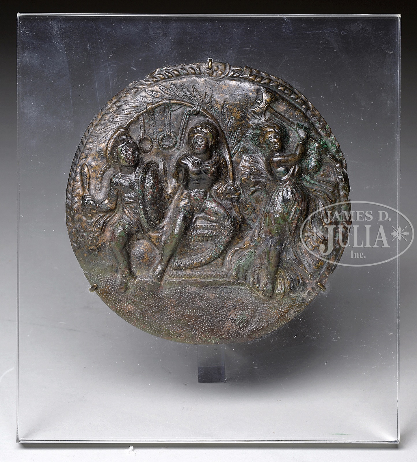 BRONZE PLAQUE.First century A.D., Roman. Round shape with repousse decoration of three figures in combat. SIZE: 5″ d. PROVENANCE: The Estate of Anthony M. Kurland Jr of Maine. Archaeologist with degree from Yale and PhD from Harvard. CONDITION: Verdigris and wear consistent with age. 9-93153 (800-1,200) – Lot 2711