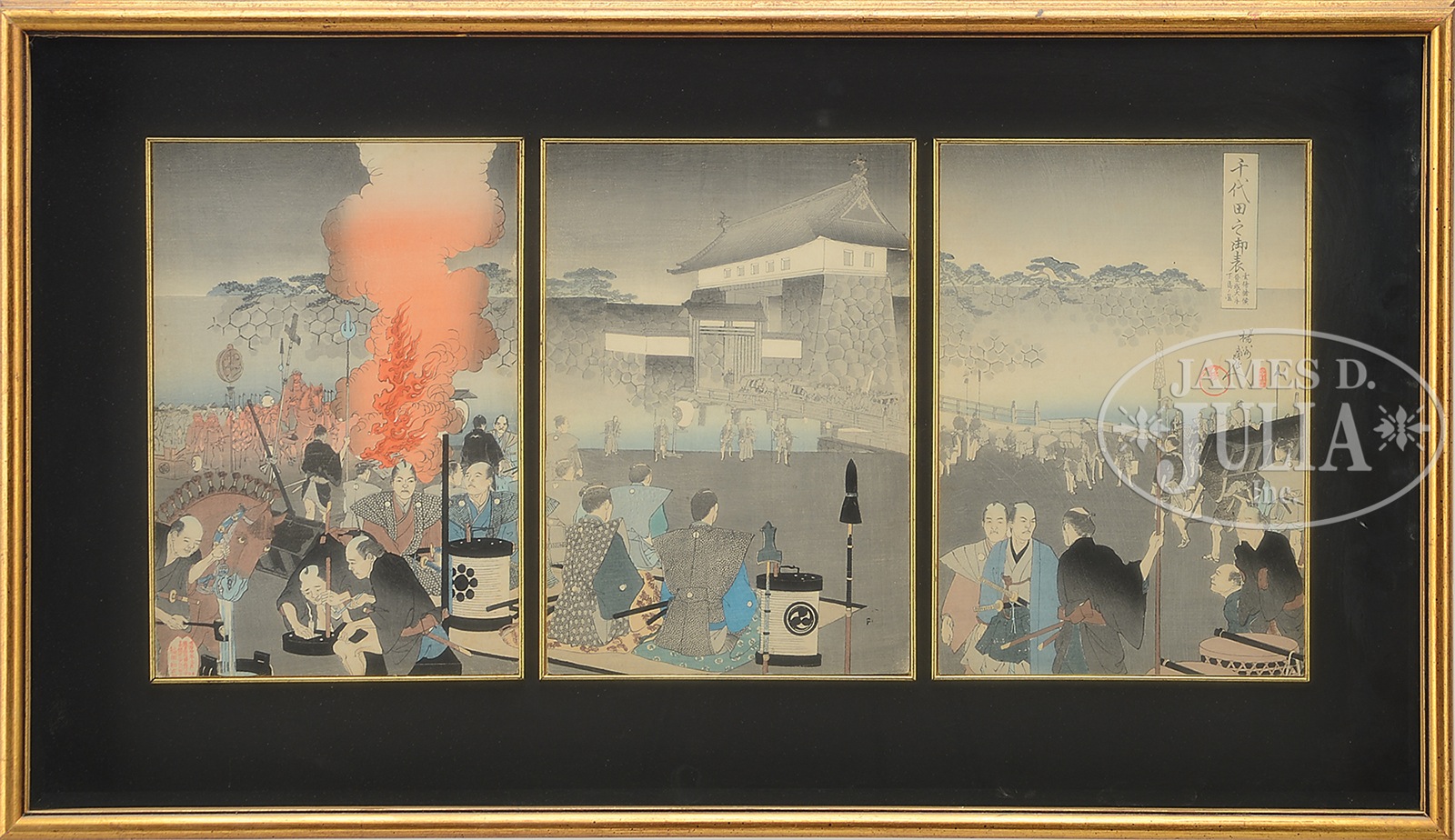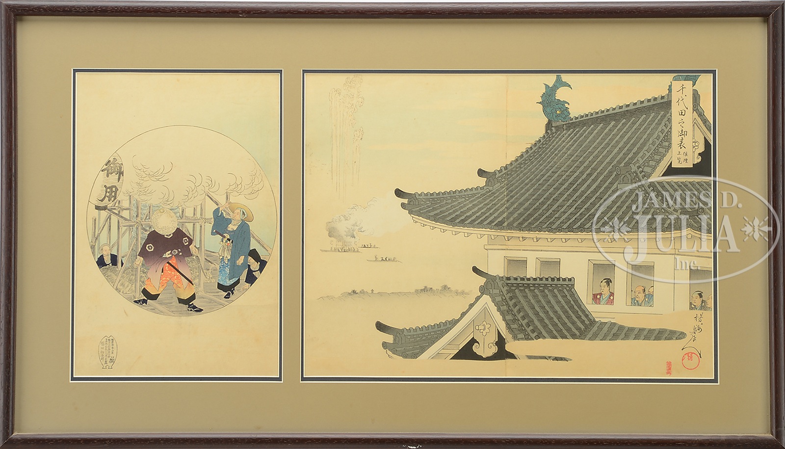 TWO JAPANESE WOODBLOCK PRINT TRIPTYCHS MILITARY SCENES BY CHIKANOBU.1) Circa late 19th century. Shogun’s at the palace, from the series “Chiyoda Palace”, by the artist Chikanobu, published by Fukuda, nicely framed and matted as a single sheet and a diptych. 2) Circa late 19th century. Shogun’s ceremony, from the series “Chiyoda Palace”, by the artist Chikanobu, published by Fukuda, nicely framed and matted in separate sheets within shadow box. SIZE: 1) 3 sheet ōban tate-e. Block size 13-3/4″ x 9″, 34.93cm x 22.86cm. 2) 3 sheet ōban tate-e. Block size 13-3/4″ x 9″, 34.93cm x 22.86cm. PROVENANCE: From a Maine collection. CONDITION: 1) Very good, slight discoloration at join, margins unavailable for observation, not examined out of frame. 2) Very good with a tiny bit of wear around edges, margins unavailable for observation, not examined out of frame. 9-94606, 9-94607 (200-300) – Lot 2712