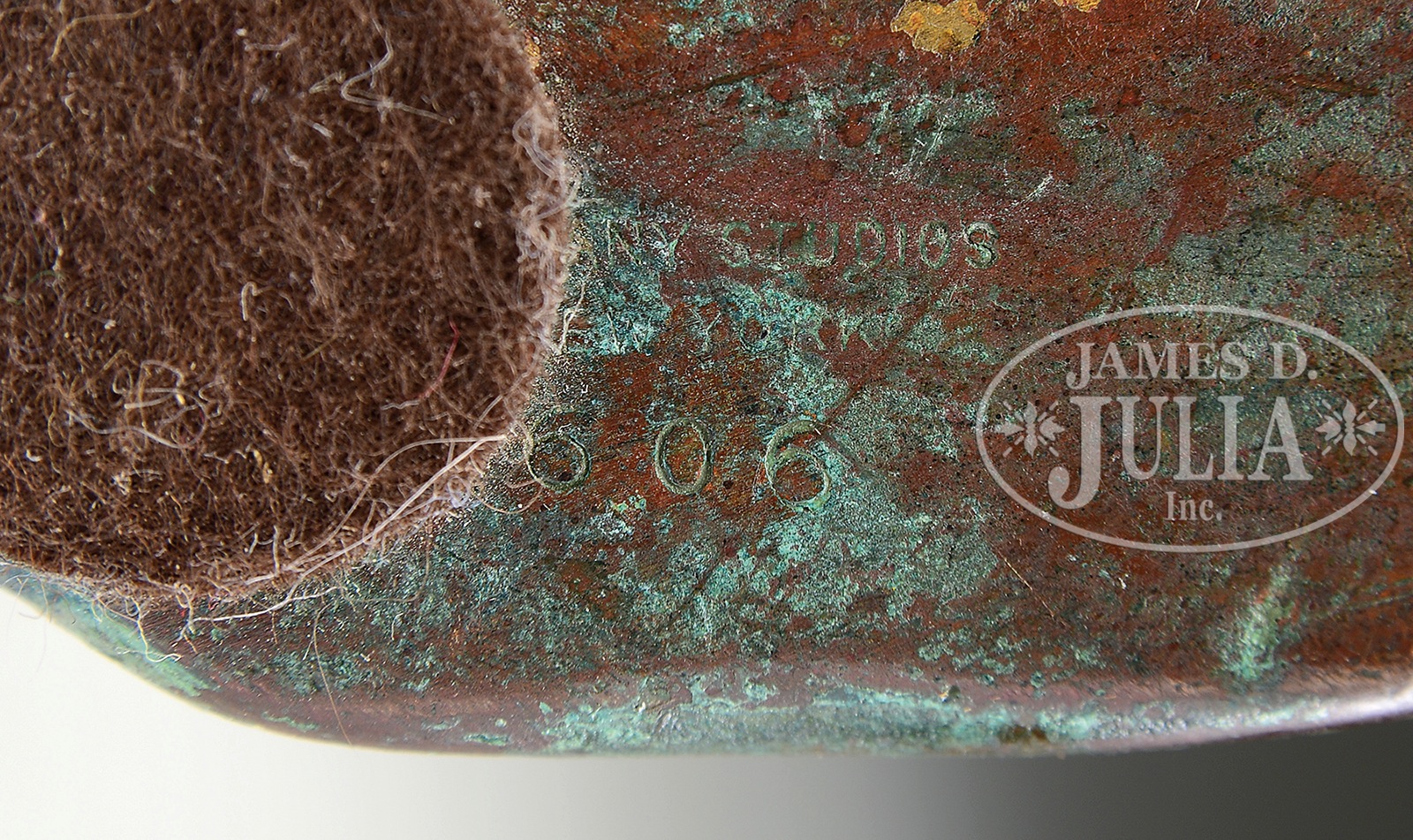TIFFANY STUDIOS DESK LAMP.Tiffany Studios desk lamp has Art Nouveau base with vertically ribbed stem and three arm spider with leaf decoration. Lamp is finished with a rich brown patina and strong green highlights. Base supports a bronze Tiffany Studios dome shade which has a removable silver colored metal liner. Shade is unsigned. Base is signed Tiffany Studios New York 606″. SIZE: Shade is 7″ dia. Lamp is 12-1/2″ t. CONDITION: Very good to excellent. 5-68736 (2,800-3,200) – Lot 2720