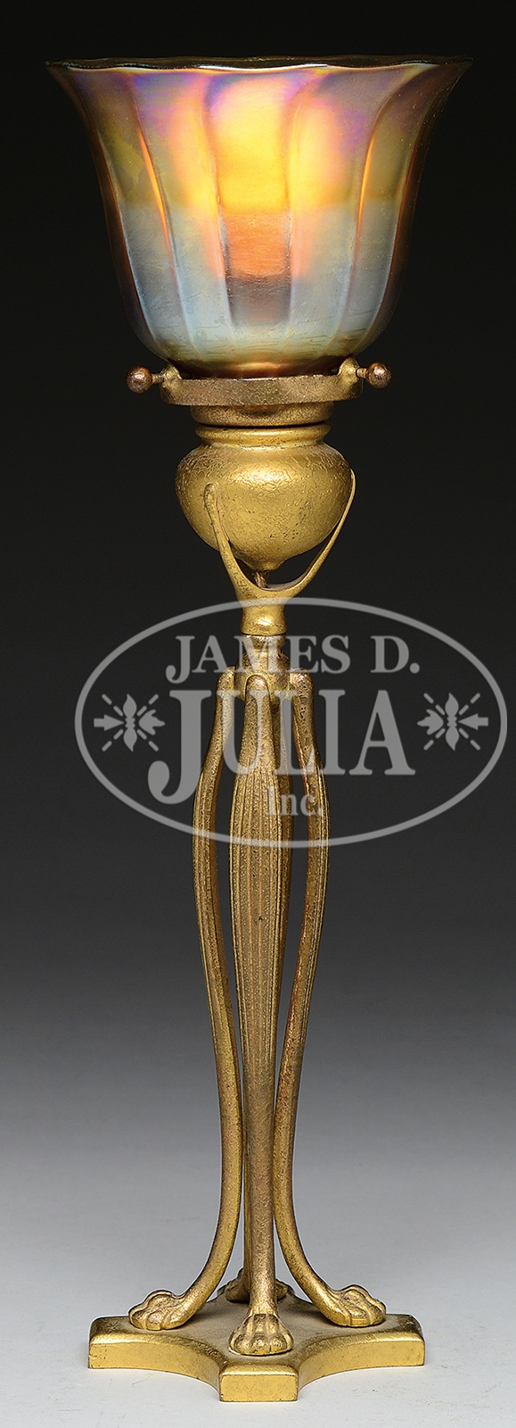 TIFFANY STUDIOS CAT PAW CANDLESTICK WITH SHADE.Candlestick is finished in gold dore and has been electrified with a single socket and shade holder. Lamp is topped with a Tiffany favrile shade with vertically ribbed body and bright gold iridescence showing blue and pink highlights. Shade is signed inside fitter “L.C.T. Favrile”. Candlestick is signed “Tiffany Studios New York 1201”. SIZE: Shade is 5″ t. Lamp is 15″ t. CONDITION: Candlestick has been drilled to electrify and has replacement screws on the underside holding platform to cat paws. 5-68760 (1,500-2,500) – Lot 2725