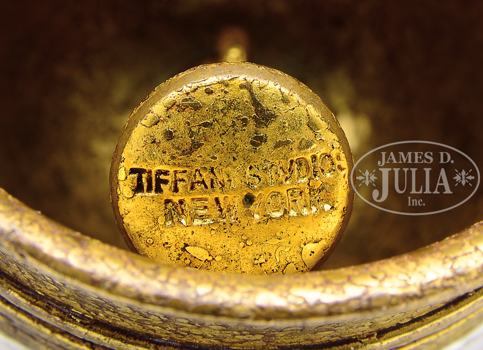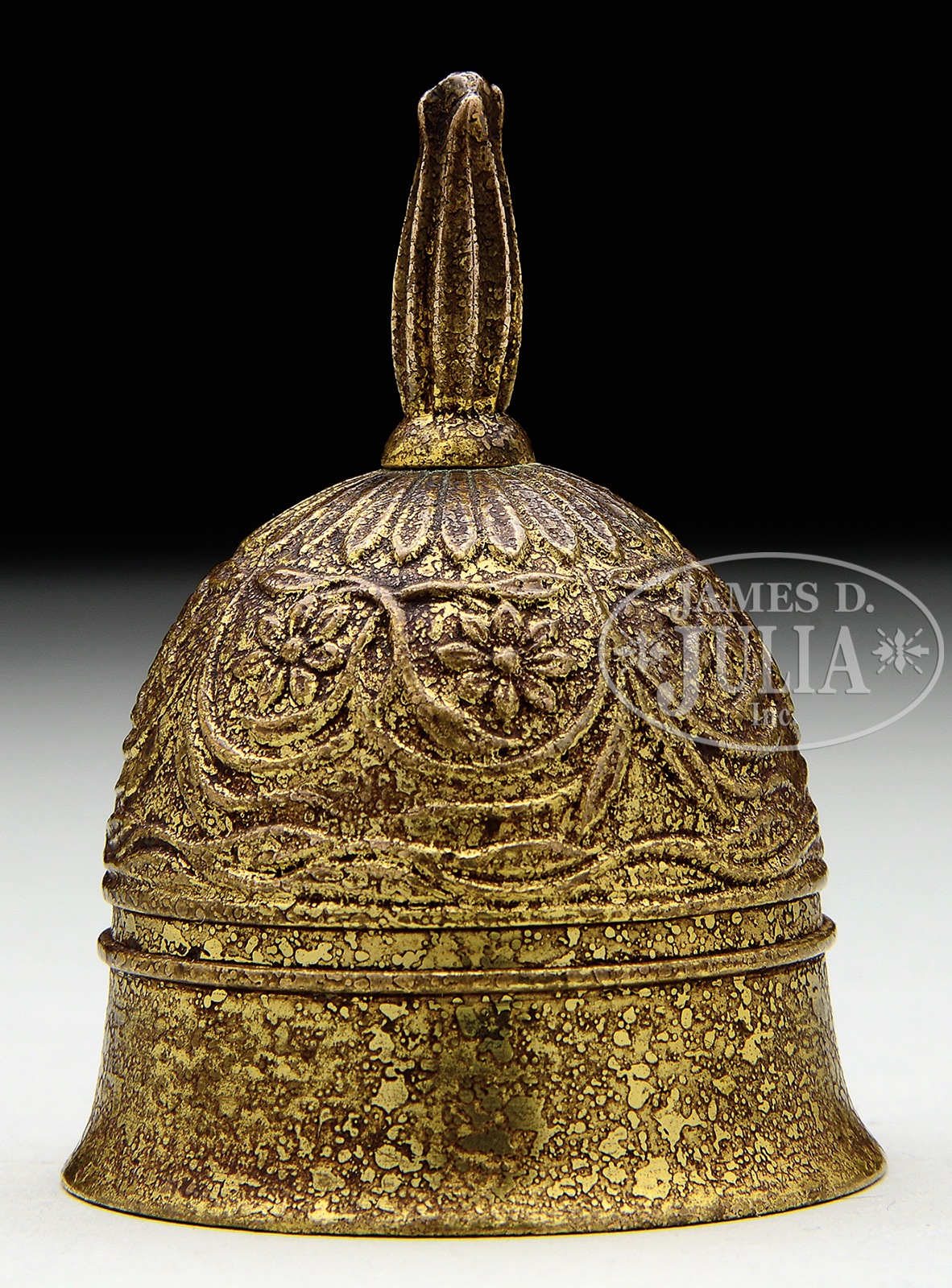 RARE TIFFANY STUDIOS BELL.Rare Tiffany Studios bronze bell is impressed with a floral design and flower bud handle. The bell is finished in gold dore and stamped on the end of the clapper “Tiffany Studios New York”. SIZE: 2-5/8″ t. CONDITION: Very good to excellent. 5-67917 (1,500-2,500) – Lot 2738