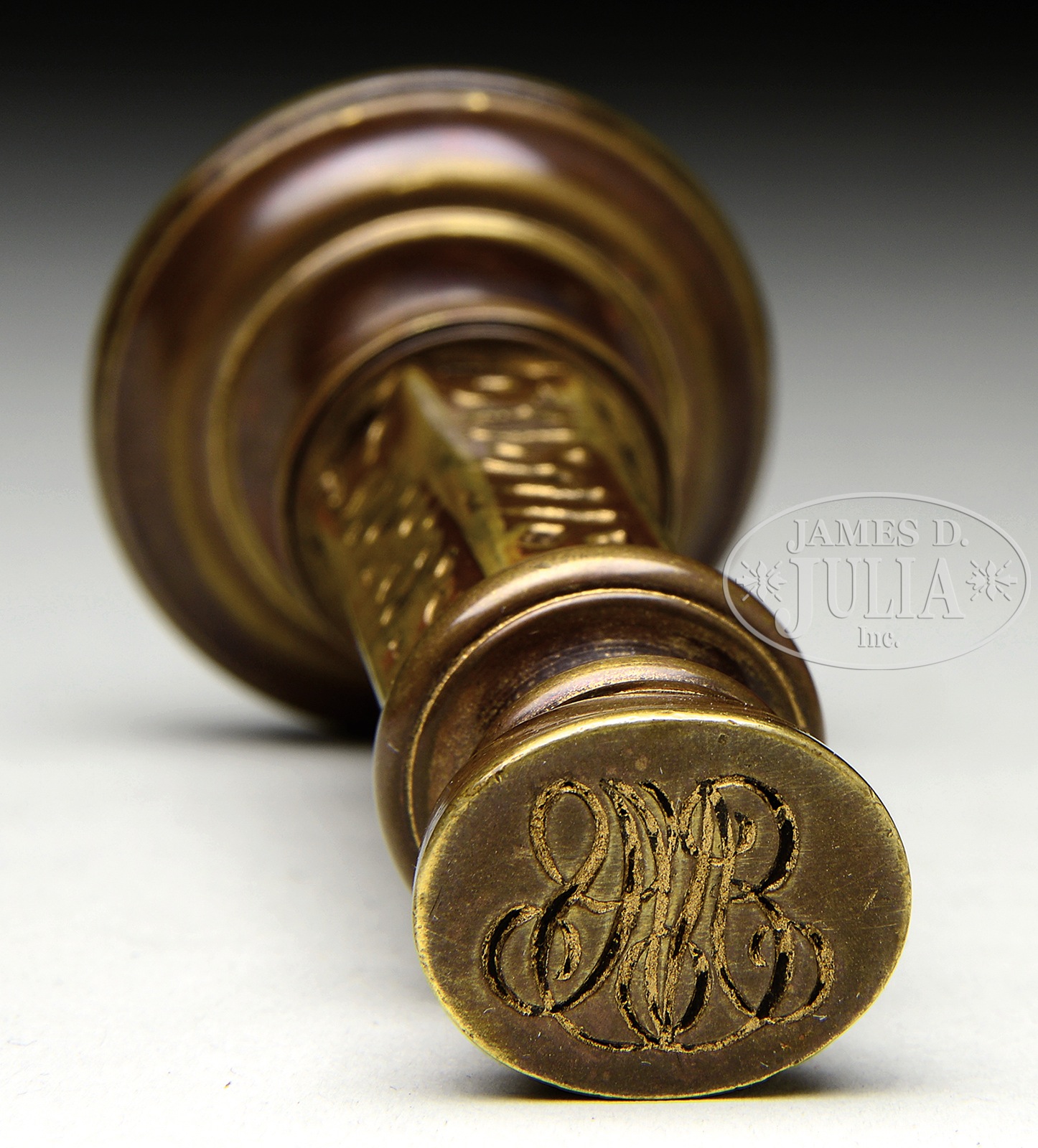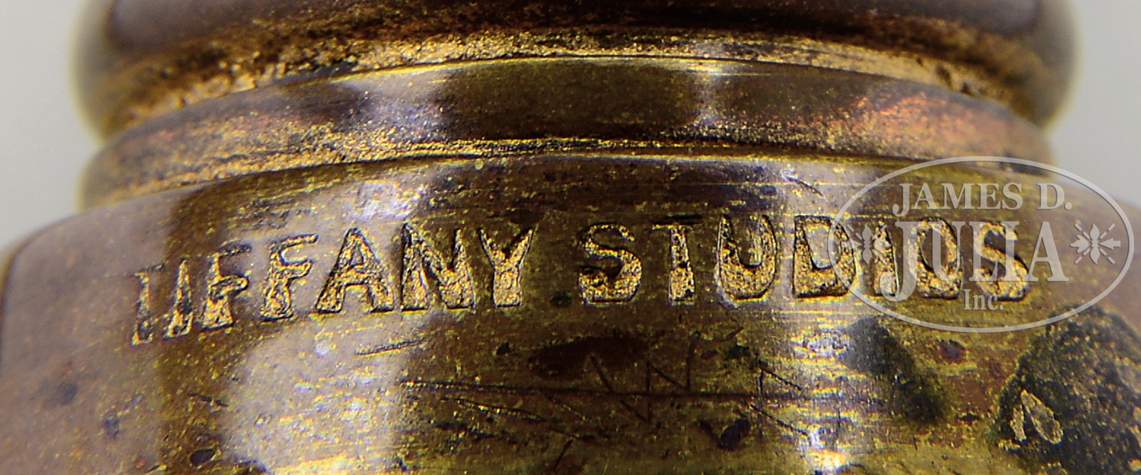 TIFFANY STUDIOS PINE NEEDLE SEAL.Tiffany Studios seal has acid etched Pine Needle pattern on the knob with caramel slag glass backing. The hexagon shaped stem of the seal is impressed with Pine Needle pattern, while the end of the seal is engraved with monogram. Stamped on the side “Tiffany Studios”. SIZE: 3″ t. CONDITION: Knob has come loose from stem and brown patina is mostly worn. 5-67926 (900-1,200) – Lot 2747