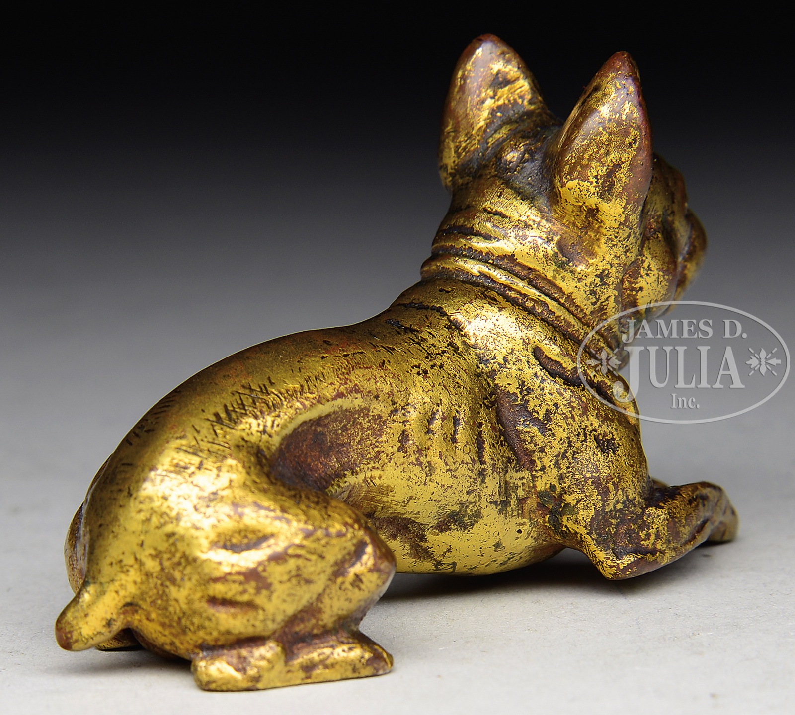 TIFFANY STUDIOS BULLDOG PAPERWEIGHT.Tiffany Studios bronze paperweight depicts a reclining bulldog. The paperweight has gold patina and is marked on the underside “Tiffany Studios New York”. SIZE: 2″ l. CONDITION: Very good to excellent with some minor discoloration to patina. 5-67945 (900-1,200) – Lot 2748