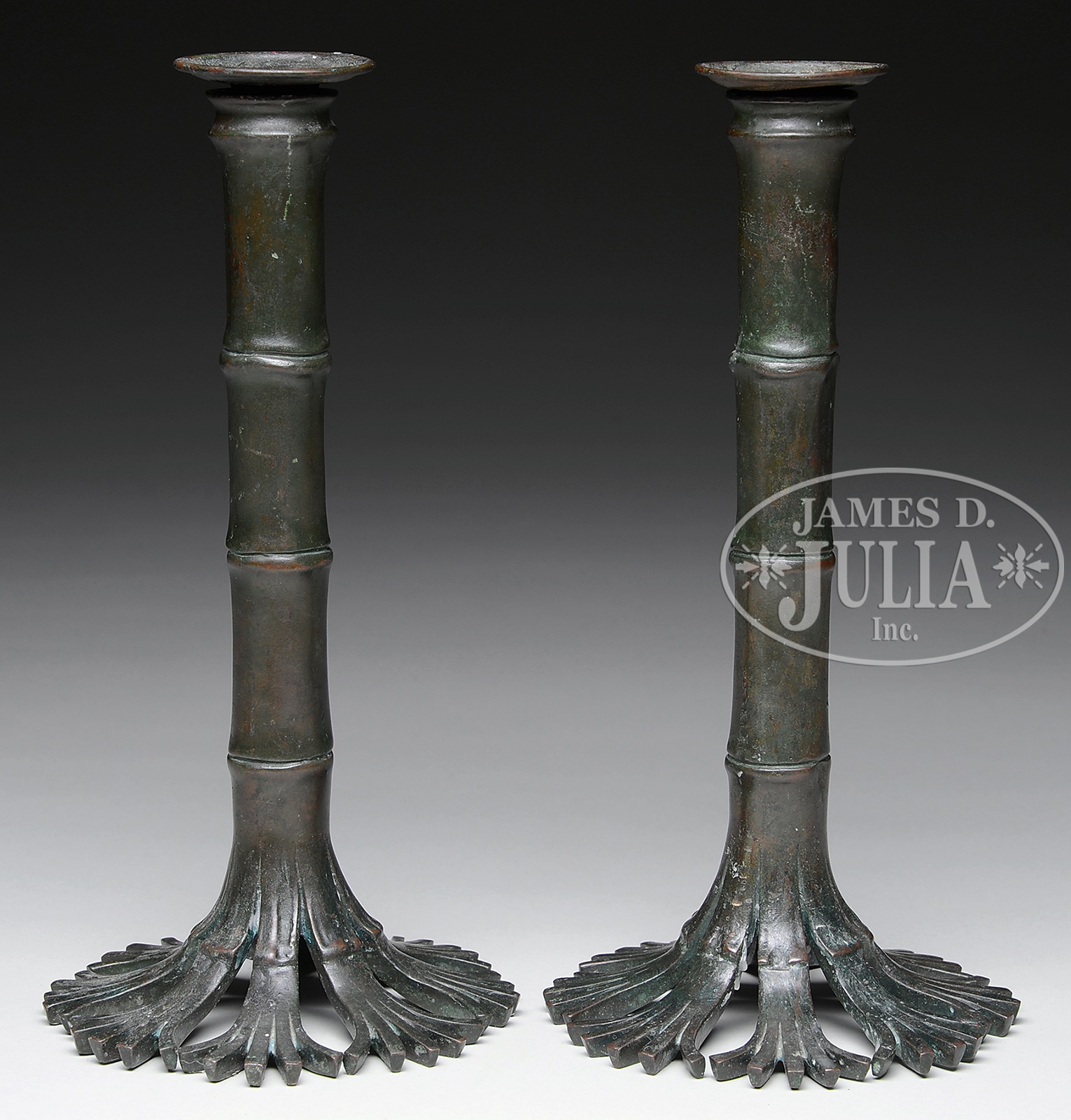 PAIR OF TIFFANY BAMBOO CANDLESTICKS.Pair of Tiffany Studios bamboo candlesticks are finished in a rich brown patina with green highlights and each topped with a bobeche. Each candlestick is signed on the underside “Tiffany Studios New York 1205”. SIZE: 10″ t each. CONDITION: Very good to excellent. 5-69157 (1,000-2,000) – Lot 2750a