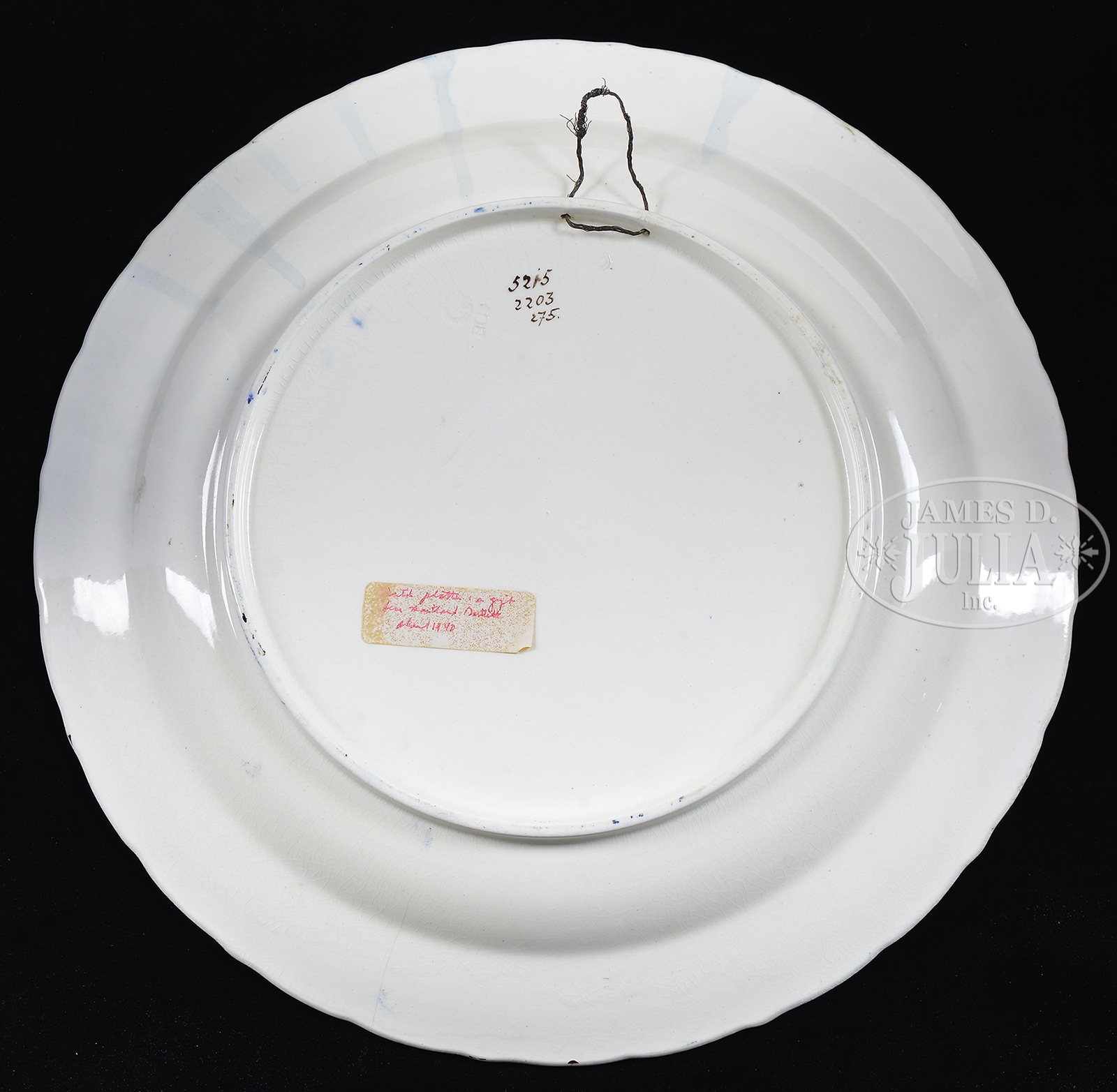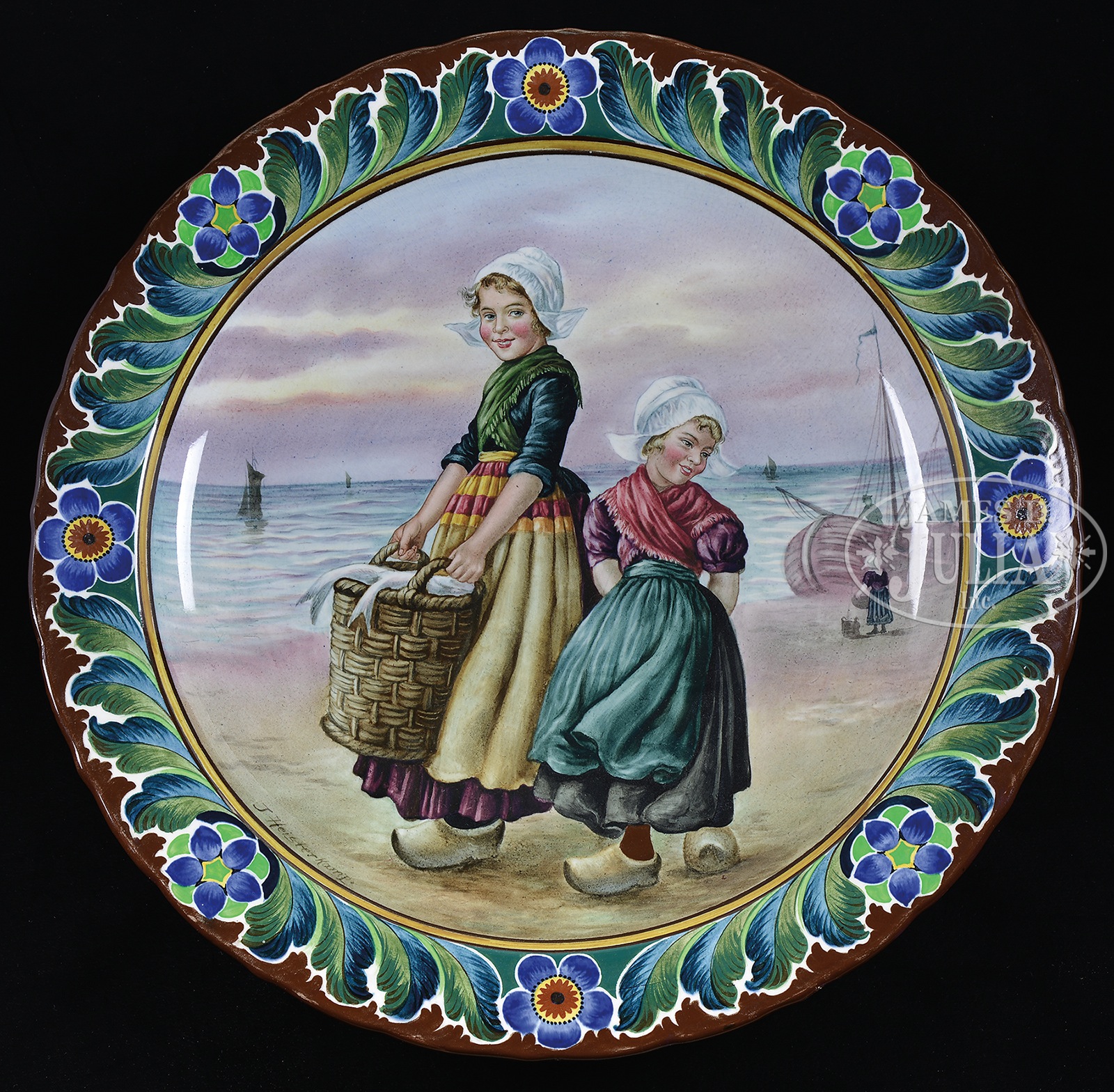 FINE CONTINENTAL WALL PLAQUE ARTIST SIGNED J. HEISTERKAMP.19th/20th century ceramic wall charger finely decorated with floral and leaf border framing a hand painted scene of two young Dutch girls with a basket of fish, with sailing ships in the background. The girls are clothed in white bonnets and colorful peasant dress. SIZE: 17 1/4″ Dia CONDITION: Very good. 9-93292 (300-500) – Lot 2765