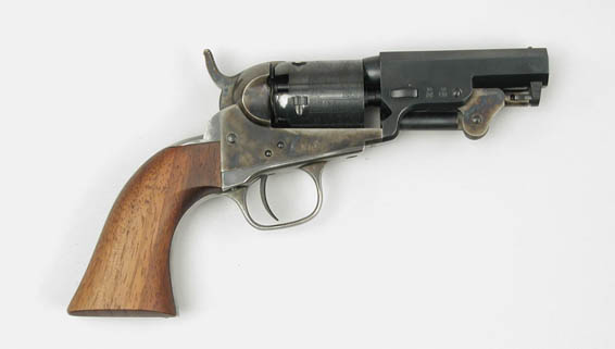 ALLEN REPRODUCTION COLT 49 POCKET. CAL. 31. Blue and case colored with 3″ oct. bbl with rammer, silver-plated grip frame with 1-pc walnut grips. SN 00402 CONDITION: As new, probably unfired. Retains virtually all its orig. finish to both metal and wood, one or two small scratches on the back strap. 4-45149 JL359 (100-150)
