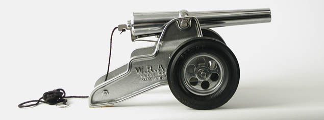 WINCHESTER CHROME PLATED SIGNAL CANNON. CAL. 10ga. blank. Late manufactured signal cannon by the Bellmore-Johnson Tool Co. under license from Winchester. Completely chrome plated with solid black composition tires in its orig. wooden Winchester marked shipping crate complete with lid, screws and instruction pamphlet. SN D474 CONDITION: Excellent having been fired but as new. Complete with its orig. lanyard. Retaining most of its orig. chrome finish with one small chip on the trail. 4-45397 JL175 (800-1,200)