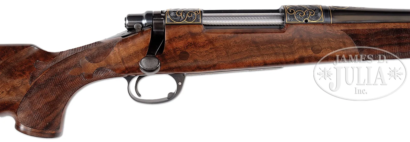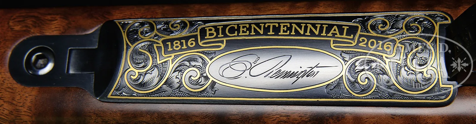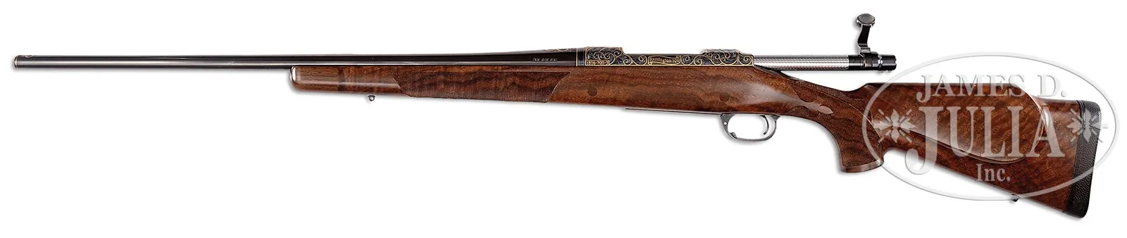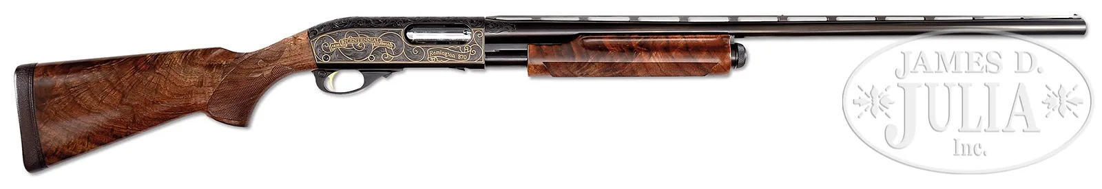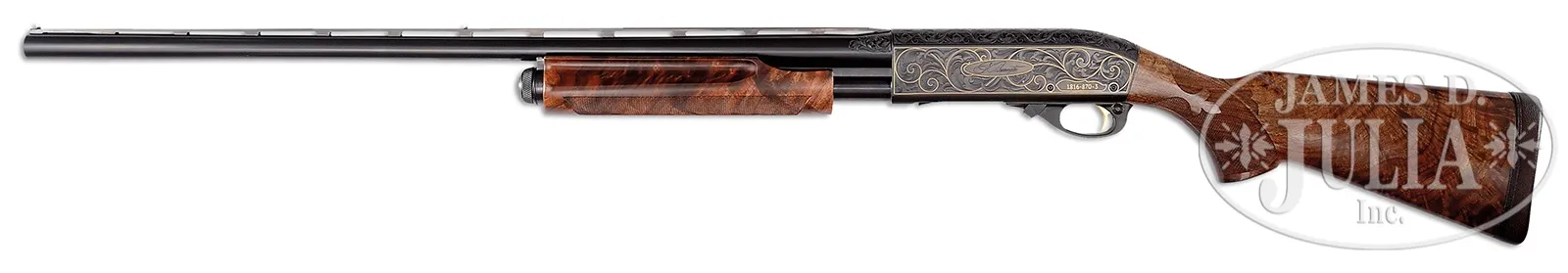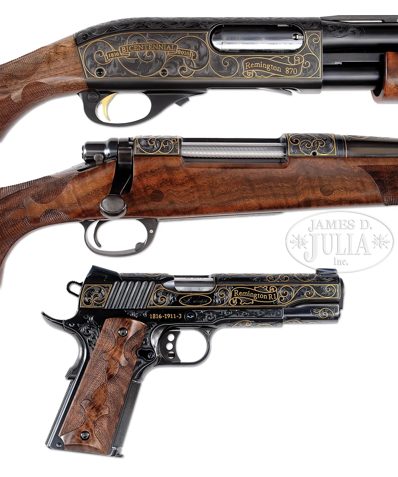 *TRULY SPECTACULAR REMINGTON BICENTENNIAL THREE GUN SET COMMEMORATING REMINGTON’S 200 YEARS IN BUSINESS WITH ALL SALE PROCEEDS BEING DONATED TO BENEFIT REMINGTON’S CONSERVATION FUNDS.SN 1816-700-3/1816-870-3/1816-1911-3. This charity auction includes a set of 3 extraordinary Remington’s built by Remington’s custom shop in Sturgis, SD to commemorate Remington Arms Cos. 200 consecutive years in business producing fine arms for sportsman and government users around the world. Proceeds from this sale will benefit Remington Arm Cos. Conservation efforts. James D. Julia Auctions is honored to have been selected by Remington as a partner to Remington Arms Co. to market this set which is one of only four that are being produced, this one the only one available for public sale. This set, # 3 of 4, is entirely hand-made and hand-finished and includes a Remington Model 700 in 7MM Mag, a Remington Model 870 in 12 gauge and a Model 1911R1 in 45ACP caliber. Gun #1 Remington Model 700 7MM Magnum stocked in exhibition fiddle back, hand selected, American black walnut- specifically selected for high fiddle back figure, with rosewood nose cap, is finely checkered with fleur-de-lis behind bolt and fine panel around wrist and fleur-de-lis at forearm. Action is fabulously engraved in scroll & floral pattern with exceptional and extensive gold line work throughout as engraved by Remington Custom Shop engraver Jesse Kaufman. Bolt is vividly jeweled and finely polished. Left side of action with SN in gold and marked “Remington 700″ in gold with gold banner outline. Breech of bbl with 2” burst of scroll with gold line work. Center of bbl marked “Remington Custom Shop Ilion, NY” and muzzle with 1″ scroll and gold line work and gold bbl band at muzzle, blued trigger. Floorplate with sensational engraving showing engraved Eliphalet Remington signature in gold lined oval and floral scroll work with gold line accents in near full coverage. Also on floorplate in a beautiful gold outline banner “1816 / Bicentennial / 2016″ in gold. Trigger guard with burst of scroll and gold line outline work. Pistol grip cap in finely finished rosewood. Buttstock with Monte Carlo and finely finished cheekpiece. Superb dark maroon colored leather covered pad. Sling mounts installed at forearm and at toe. This gun is housed in a custom cut-out Pelican brand travel case. Weight: 7 lbs. 13 oz. Gun #2 Remington Model 870, 12 gauge. 27” bbl with matted low profile ventilated rib with steel mid bead and white front bead. Choke tube currently installed. Gold plated trigger. Blued carrier and finely polished bolt. Stock is exhibition quality and hand selected for its exceptional fiddle back black American walnut with rosewood capped pistol grip and checkered in fancy fleur-de-lis pattern. Butt is finished with a high quality dark maroon leather covered pad. Forearm is finely hand checkered in fleur-de-lis pattern. Receiver is sensationally scroll & floral shaded engraved by noted Remington Arms Co. custom shop engraver Jesse Kaufman. Top of receiver is fully scroll engraved. Right side of receiver with beautiful large open floral scroll accented by exceptional gold line work and gold line border. Right side also with “1816 / Bicentennial / 2016” in gold in a gold bordered ribbon. “Remington 870” in gold bordered banner. Left side of receiver fully engraved in open floral scroll with gold line accents and gold line border with Eliphalet Remington signature at center in gold oval. Serial number in gold towards bottom back left of action. Also included with this gun is a custom cut Pelican hard plastic case. Weight: 7 lbs 5 oz. Gun #3 Remington Model 1911R1 45ACP cal. Fabulous custom pistol with spectacular open floral scroll engraving throughout by Remington custom shop engraver Jesse Kaufman. This finely finished pistol exhibits a vastly higher degree of high polish blued finish than is seen on 1911R1 pistols. Slide is near fully engraved with open floral scroll and gold borders along with gold line accents throughout. Left side of slide with “1816 / Bicentennial / 2016” in gold bordered ribbon. Right side of slide near fully engraved with gold lined border work and gold line accents. Signature of Eliphalet Remington in gold oval and “Remington R1” in gold which is in a gold bordered banner. Serial number on right side of action frame in gold. Bottom of bbl and action in superb open floral scroll engraving with gold line accents as is trigger guard. Grips are of fabulously figured hand-selected American black walnut and checkered in fleur-de-lis pointing pattern. Top of bbl accented with high luster blued “Novak” rear and front sight. The polish work on this gun is absolutely spectacular and one can almost see his or her reflection in the high polish blue. Accompanied by a green “Remington” hard plastic case and 2 magazines in case, along with instruction pamphlet, multi-tool and trigger lock. CONDITION: As new from Remington and unfired. 51095-1 JSL (25,000-50,000) – Lot 3000