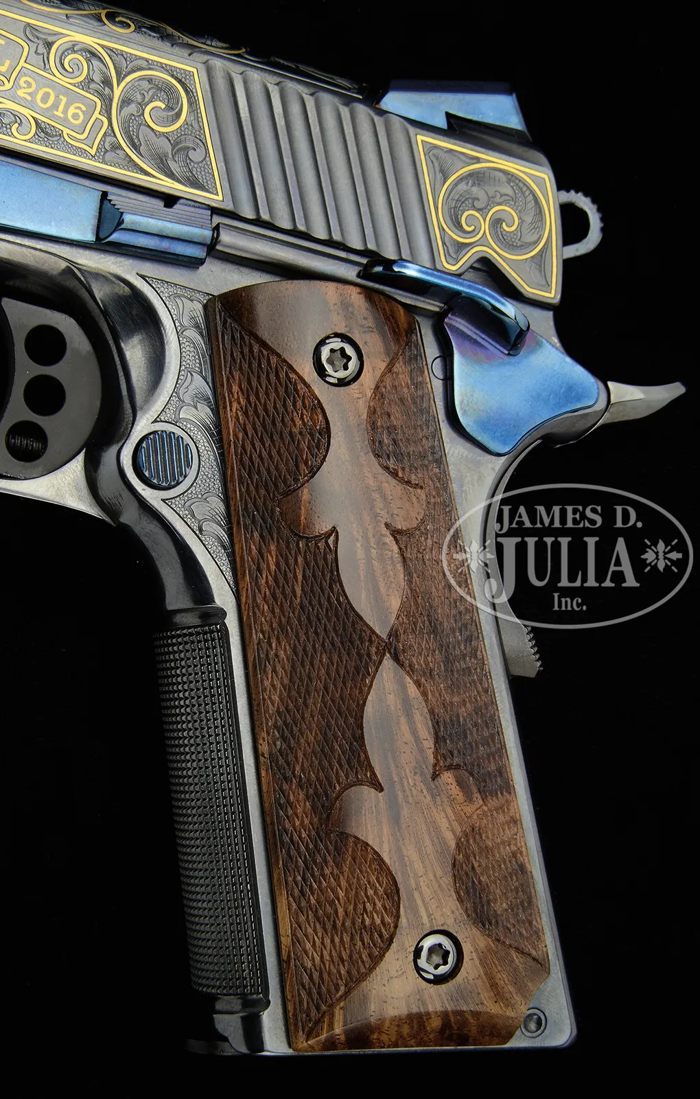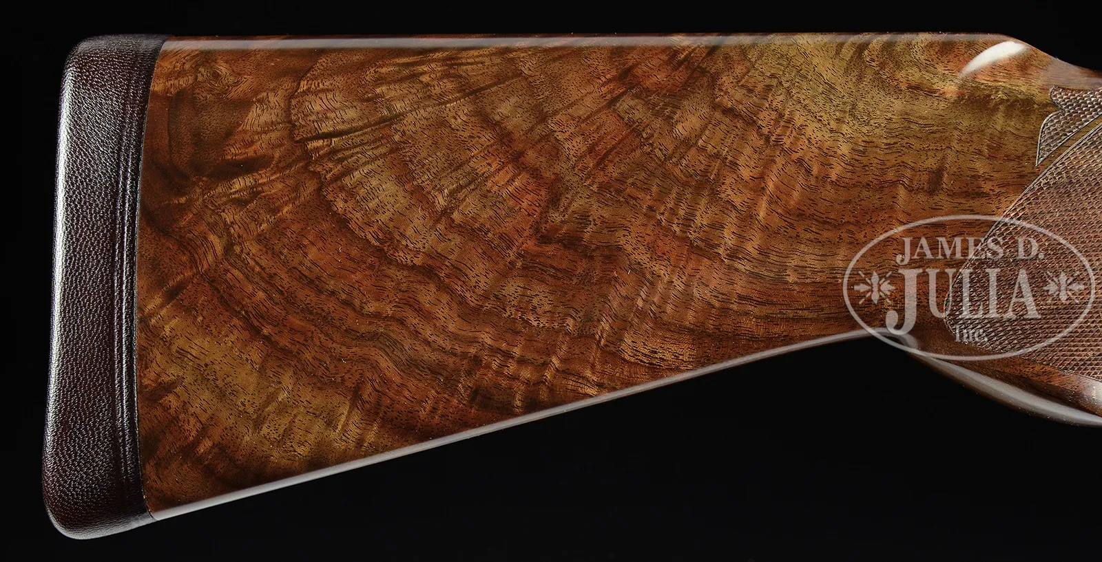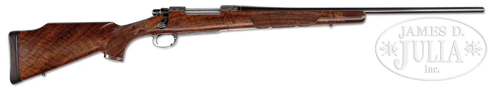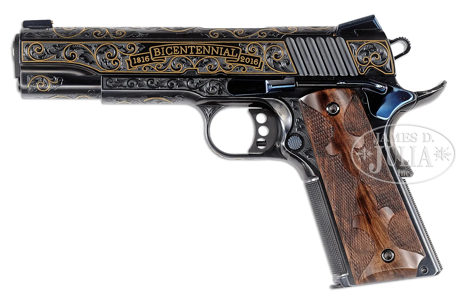 *TRULY SPECTACULAR REMINGTON BICENTENNIAL THREE GUN SET COMMEMORATING REMINGTON’S 200 YEARS IN BUSINESS WITH ALL SALE PROCEEDS BEING DONATED TO BENEFIT REMINGTON’S CONSERVATION FUNDS.SN 1816-700-3/1816-870-3/1816-1911-3. This charity auction includes a set of 3 extraordinary Remington’s built by Remington’s custom shop in Sturgis, SD to commemorate Remington Arms Cos. 200 consecutive years in business producing fine arms for sportsman and government users around the world. Proceeds from this sale will benefit Remington Arm Cos. Conservation efforts. James D. Julia Auctions is honored to have been selected by Remington as a partner to Remington Arms Co. to market this set which is one of only four that are being produced, this one the only one available for public sale. This set, # 3 of 4, is entirely hand-made and hand-finished and includes a Remington Model 700 in 7MM Mag, a Remington Model 870 in 12 gauge and a Model 1911R1 in 45ACP caliber. Gun #1 Remington Model 700 7MM Magnum stocked in exhibition fiddle back, hand selected, American black walnut- specifically selected for high fiddle back figure, with rosewood nose cap, is finely checkered with fleur-de-lis behind bolt and fine panel around wrist and fleur-de-lis at forearm. Action is fabulously engraved in scroll & floral pattern with exceptional and extensive gold line work throughout as engraved by Remington Custom Shop engraver Jesse Kaufman. Bolt is vividly jeweled and finely polished. Left side of action with SN in gold and marked “Remington 700″ in gold with gold banner outline. Breech of bbl with 2” burst of scroll with gold line work. Center of bbl marked “Remington Custom Shop Ilion, NY” and muzzle with 1″ scroll and gold line work and gold bbl band at muzzle, blued trigger. Floorplate with sensational engraving showing engraved Eliphalet Remington signature in gold lined oval and floral scroll work with gold line accents in near full coverage. Also on floorplate in a beautiful gold outline banner “1816 / Bicentennial / 2016″ in gold. Trigger guard with burst of scroll and gold line outline work. Pistol grip cap in finely finished rosewood. Buttstock with Monte Carlo and finely finished cheekpiece. Superb dark maroon colored leather covered pad. Sling mounts installed at forearm and at toe. This gun is housed in a custom cut-out Pelican brand travel case. Weight: 7 lbs. 13 oz. Gun #2 Remington Model 870, 12 gauge. 27” bbl with matted low profile ventilated rib with steel mid bead and white front bead. Choke tube currently installed. Gold plated trigger. Blued carrier and finely polished bolt. Stock is exhibition quality and hand selected for its exceptional fiddle back black American walnut with rosewood capped pistol grip and checkered in fancy fleur-de-lis pattern. Butt is finished with a high quality dark maroon leather covered pad. Forearm is finely hand checkered in fleur-de-lis pattern. Receiver is sensationally scroll & floral shaded engraved by noted Remington Arms Co. custom shop engraver Jesse Kaufman. Top of receiver is fully scroll engraved. Right side of receiver with beautiful large open floral scroll accented by exceptional gold line work and gold line border. Right side also with “1816 / Bicentennial / 2016” in gold in a gold bordered ribbon. “Remington 870” in gold bordered banner. Left side of receiver fully engraved in open floral scroll with gold line accents and gold line border with Eliphalet Remington signature at center in gold oval. Serial number in gold towards bottom back left of action. Also included with this gun is a custom cut Pelican hard plastic case. Weight: 7 lbs 5 oz. Gun #3 Remington Model 1911R1 45ACP cal. Fabulous custom pistol with spectacular open floral scroll engraving throughout by Remington custom shop engraver Jesse Kaufman. This finely finished pistol exhibits a vastly higher degree of high polish blued finish than is seen on 1911R1 pistols. Slide is near fully engraved with open floral scroll and gold borders along with gold line accents throughout. Left side of slide with “1816 / Bicentennial / 2016” in gold bordered ribbon. Right side of slide near fully engraved with gold lined border work and gold line accents. Signature of Eliphalet Remington in gold oval and “Remington R1” in gold which is in a gold bordered banner. Serial number on right side of action frame in gold. Bottom of bbl and action in superb open floral scroll engraving with gold line accents as is trigger guard. Grips are of fabulously figured hand-selected American black walnut and checkered in fleur-de-lis pointing pattern. Top of bbl accented with high luster blued “Novak” rear and front sight. The polish work on this gun is absolutely spectacular and one can almost see his or her reflection in the high polish blue. Accompanied by a green “Remington” hard plastic case and 2 magazines in case, along with instruction pamphlet, multi-tool and trigger lock. CONDITION: As new from Remington and unfired. 51095-1 JSL (25,000-50,000) – Lot 3000