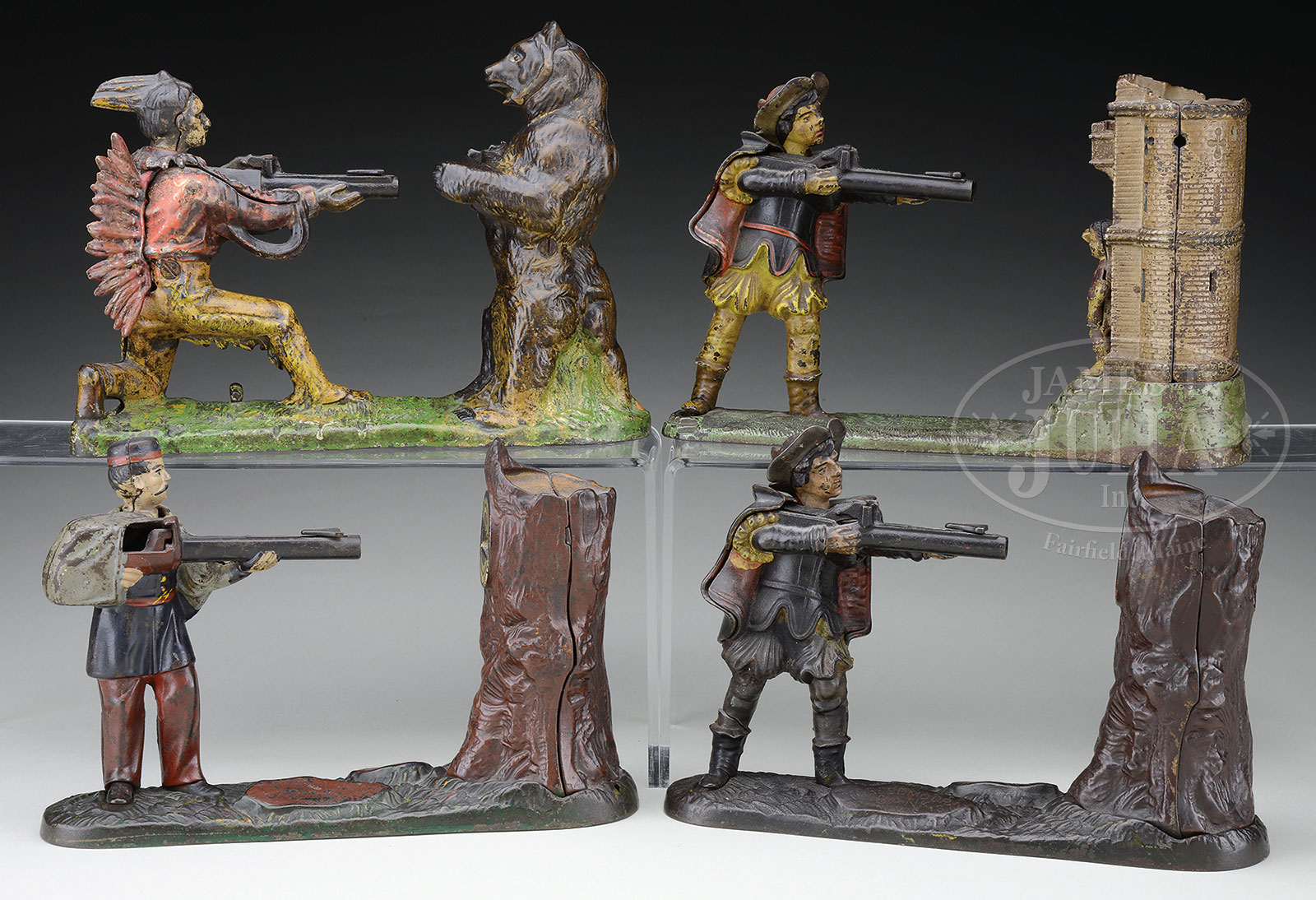 GROUP OF FOUR CAST-IRON MECHANICAL BANKS INCLUDING NEW CREEDMOOR BANK, INDIAN AND BEAR, CREEDMOOR BANK, AND WILLIAM TELL.1) New Creedmoor Mechanical Bank. Manufactured by J. & E. Stevens Co., ca. 1877. Pull the coin launcher back into position. Place the coin in front of the launcher and press the foot. The coin is fired into the tree. 2) Made by the J. & E. Stevens Company, Cromwell, Connecticut, circa 1885. Base cast with “PATD JAN 17 1888.” Bank lock impressed “PATD FEB 2 1875.” Cock the rifle and place a coin flat on the barrel. Pull the lever towards you and the Indian shoots the bear in the chest with the coin. 3) Classic bank made by the J. & E. Stevens Company of Cromwell, Connecticut, circa 1877. Cock the rifle and place a coin on the rifle barrel. Press the soldier’s right foot and coin is shot into the tree. 4) J & E Stevens Co., designed by Russell Frisbee, patented 6/23/1896. Place a coin in the proper position on the barrel of the rifle. Press the right foot and the rifle shoots the apple from the boy’s head. As the coin enters the castle it strikes a bell. SIZE: 1) 7″ h X 10″ l. 2) 7-1/2″ h x 10-1/2″ l. 3) 6-1/2″ h x 10″ l. 4) 6-3/4″ h x 10-1/2″ l. PROVENANCE: The Estate of Morris Racker. CONDITION: All banks functional and with original paint surfaces. All with varying degrees of abrasion and in use wear. Generally good to very good. 51956-30, 51956-31, 51956-37, 51956-38, (1,000-1,500) – Lot 3003