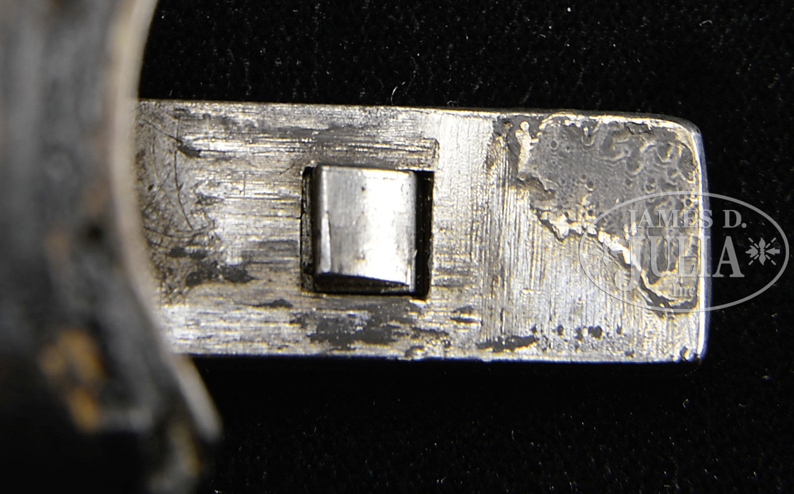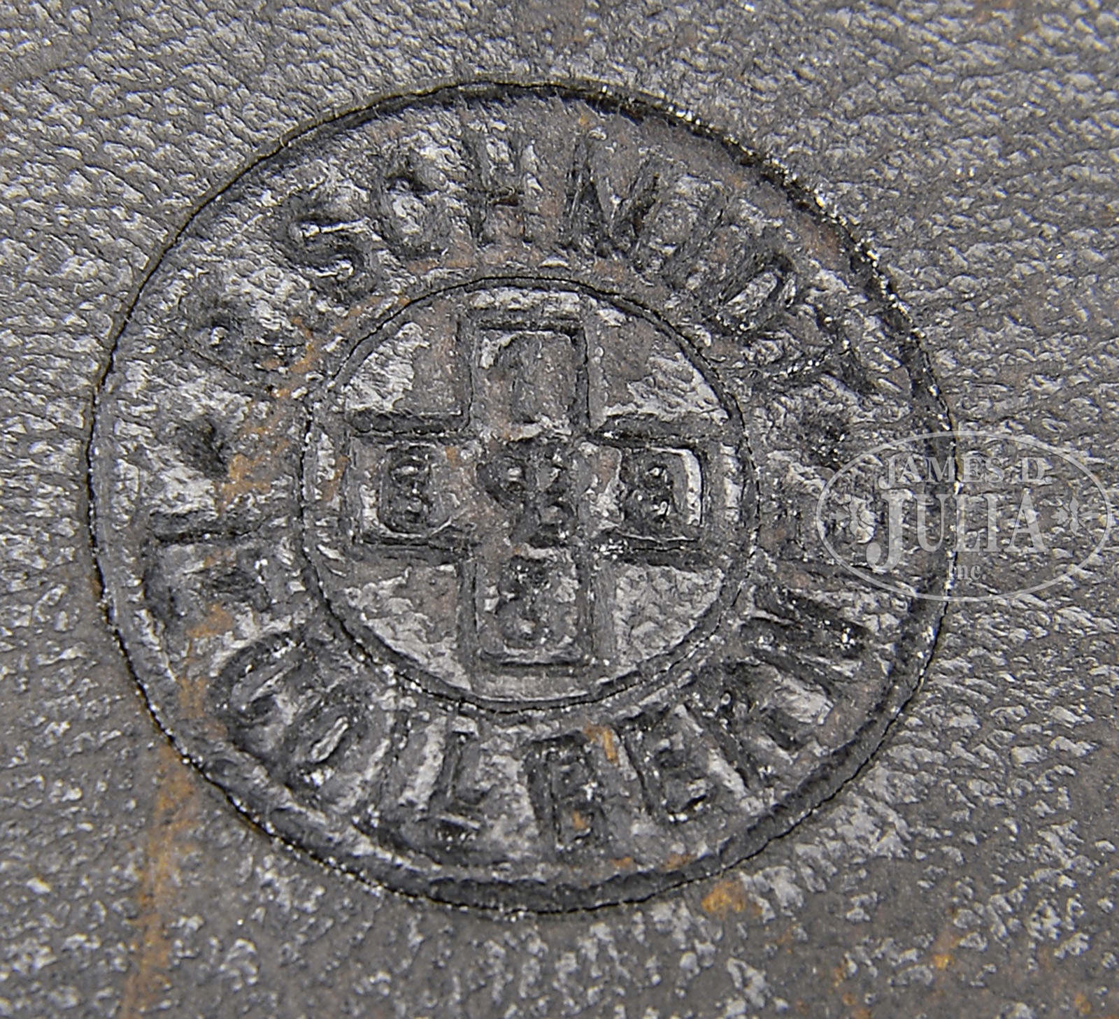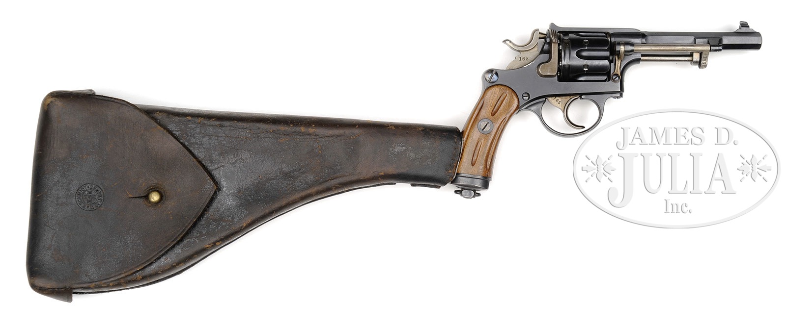 Please Note: Estimate should be $2,750-$3,000 SWISS M1882 REVOLVER WITH ORIGINAL SCHMIDT SHOULDER STOCK.SN 32165. Cal. 7.5mm. Swiss M1882 revolver with 4-1/2″ bbl, having a fixed front and rear sight. Fully matched SNs on the left side of bbl, left frame and on the cyl. The last few matching digits marked on the ejector, hammer, loading gate and trigger. The right grip panel was removed and marked with a penciled “65”. Under the panel was a previous owner’s tag, noting Schwab, Jak. from Winterthurer. Revolver was released from Army service in 1963 as reflected by the “P63” on the left side of the frame. Major components with orig rust blue; minor components strawed. Varnished and fluted grip panels. Complete with correct and orig leather wrapped shoulder stock whose lid was marked with a circular logo containing “R. Schmidt. Lt. Col. L. Bern” surrounding a Swiss cross. The inner body of the stock was lightly ink stamped “1914” – originally to match a revolver of the same number. Body of stock is missing its shoulder straps. Lug extension is correctly in the white and fits nicely into the grip recess though does not lock in place. PROVENANCE: Collection of Dr. Geoffrey Sturgess CONDITION: Revolver has a bright 98-99% orig rust blue with comparable condition strawed parts. Grips retain most of their varnish with slight thinning on the right panel. Mirror bore with sharp rifling. Perfect mechanics. Leather covered shoulder stock sound but oiled with moderate crazing. No suggestion of restitching. Lug extension has been filed to fit a particular gun and has a welded repair at the forward tip. 4-52050 LMA110 (2,250-3,000) – Lot 3004