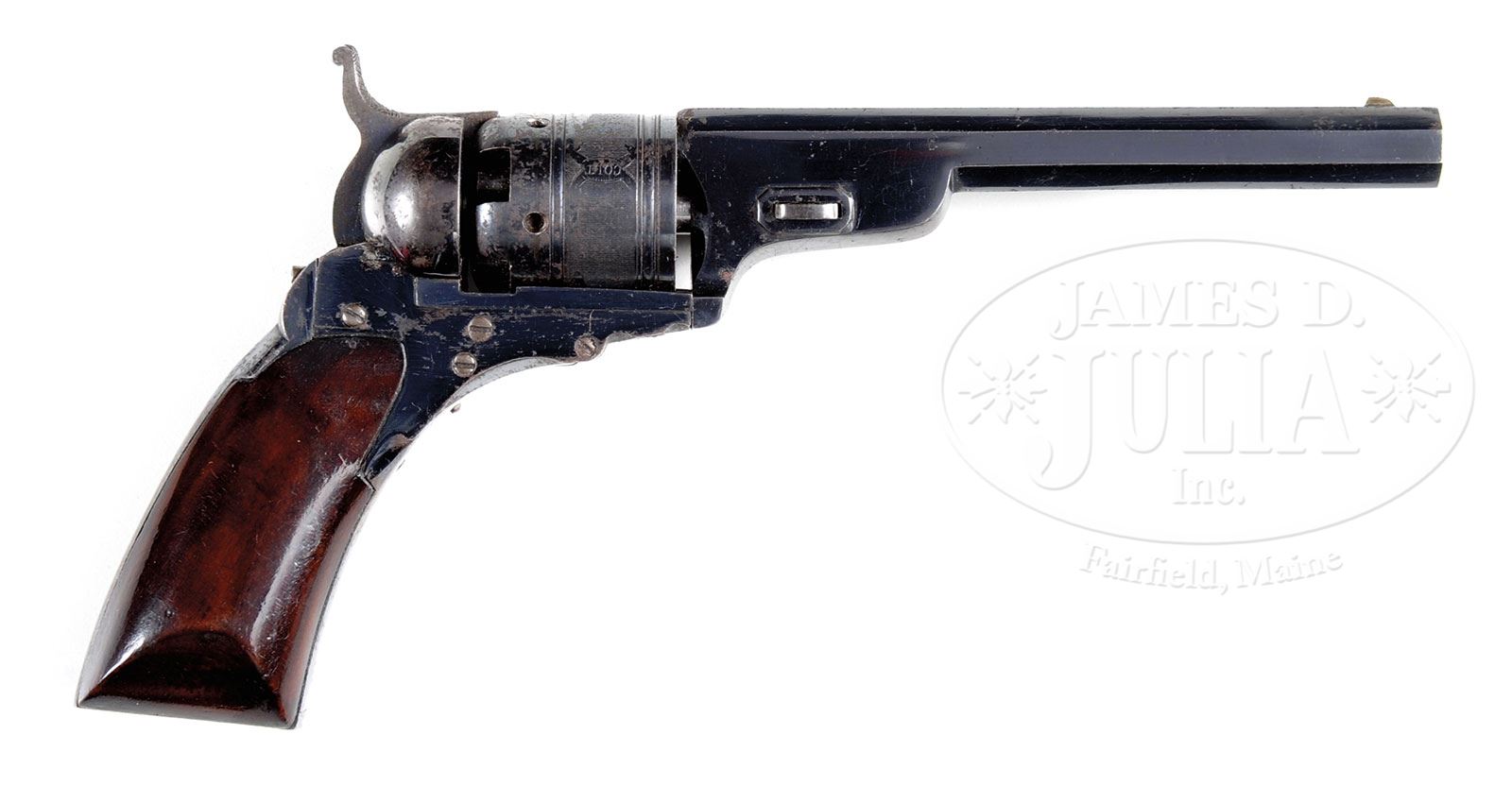 EXTRAORDINARILY RARE CASED COLT PATERSON #1 BABY PERCUSSION REVOLVER WITH 4″ BARREL AND COMPLETE ACCESSORIES.SN 457. Cal. 31. Blue finish with 4″ oct bbl, tiny German silver front sight and usual 1-line left hand script letter address which reads “Patent Arms Mg Co. Paterson N.J. – Colt’s Pt.” with dashes at each end. Cylinder has 5 chambers with centaur scene roll marking. Frame is usual configuration and is mounted with varnished 1-pc, square butt, walnut grip. Accompanied by an orig Colt casing with fluted lid and brown striped velvet lining, recessed in the bottom for the revolver, an orig copper & gold washed brass charger with matching number “53″, an orig capper numbered “89″ inside the lid and in the body, a sgl ball bullet mold with three turned walnut handles, a loading tool with nipple pick, a walnut handle brass cleaning rod and a matching numbered spare cylinder. There were about 500 of these baby-sized Paterson revolvers produced in the period 1837-1838 with a few having loading levers added in the period 1840-1841. Matching SNs were observed on rear face of bbl lug, wedge, both cyls, side of trigger, inside back strap and backstrap channel of grip. No further disassembly was effected to check for additional matching numbers. These diminutive revolvers are rarely ever encountered and of those, extremely few are cased with original accessories and rarely with much, or any, orig finish remaining. CONDITION: Extremely fine plus, all matching as noted. Bbl retains about 97-98% glossy orig blue with strong feathers on each side of front sight; overall shows only sharp edge wear; frame, recoil shields and front strap retain 88-90% glossy orig blue with light surface rust and some light flaking; top of backstrap and buttstrap retain glossy orig blue with most of the backstrap flaked to a light patina; hammer retains brilliant case colors on both sides and rear edge, turned silver on top edge; cyl in the revolver retains about 95% strong orig blue and shows about 99% centaur scene roll marking; spare cyl retains about 90% strong orig blue with some light rust and shows about 97-98% centaur scene roll marking. Grip is sound showing very light edge wear with a few light nicks in the finish and overall retains about 98-99% crisp orig varnish. Mechanics are crisp, bright shiny bore with scattered light pitting. Case is sound with light nicks & scratches and retains about 85-90% orig finish with some heat crazing, and a chemical spot in the front left corner of lid; interior is moderately faded and lightly soiled inside the lid and lightly faded with moderate soil in the bottom; charger retains about 50-60% orig finish with strong gold wash on the powder end and middle ring; capper is very fine and is a medium brass patina; all three mold handles are sound showing moderate wear and strong orig finish; mold body and sprue cutter are very fine with light, scattered surface rust and shows about 70% bright blue; tool & cleaning rod are fine. All together a complete and very rare Baby Paterson. 4-50351 JR132 (75,000-125,000) – Lot 3004