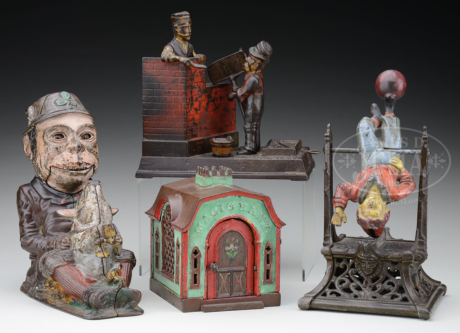 FOUR CAST-IRON MECHANICAL BANKS INCLUDING MASON BANK, BOY ON TRAPEZE, MAGIC BANK, PADDY & THE PIG.1) Shepard Hardware Co., Patented 1887, cast-iron and hand-painted, the Hod carrier receives the coin and throws it forward, depositing it into the bank as the mason raises and lowers trowel and brick, while the Hod moves forward and backwards. 2) Late 19th century. Manufactured by Barton and Smith, Philadelphia. Place a coin in boy’s head, he tumbles forward depositing the coin in the slot on the base, and completing his turn. 3) Light green color, J & E Stevens Co., Cromwell, Connecticut”. After the door is opened, which brings the cashier to the front, a slight touch on a knob at the side causes him to disappear and place the money of the depositor safely in the vault. The bank engraved beneath, “PAT’D AUG 5 1873. MAR 7 1876”. 4) J & E Stevens Co., “Patent August 8 1882” impressed in bottom of bank. “Paddy & the Pig.” Originally sold as the “Shamrock” bank. This model with brown coat and glass eyes. “Place the coin on the nose of the pig. Press the lever and the pig will strike the coin with its foot, when the man will open his mouth, catch it on his tongue, and swallow it; at the same time the eyes will roll, giving the face a pleased expression.” SIZE: 1) 7″ h. 2) 9-1/2″ h. 3) 5-1/4″ h x 5″ l. 4) 8-1/2″ h x approx. 7-1/2″ l PROVENANCE: The Estate of Morris Racker. CONDITION: 1) With original surface, areas of paint loss throughout. Bank is functional. 2) Original painted surfaces untouched with spot paint loss throughout. Manually operational. Figure tends to come to rest horizontally or in an inverted position.3) Bank is operational. We believe the green color was originally yellow. Other areas of repaint include frame of door. 4) Bank is partly operational. Pig will kick coin. Mouth of figure and tongue functioning. Paddy’s eyes do not appear to roll. May need cleaning and adjustments. Painted surfaces all appear original. All banks generally good. 51956-24 (2,000-3,000) – Lot 3004