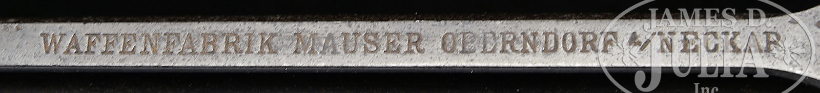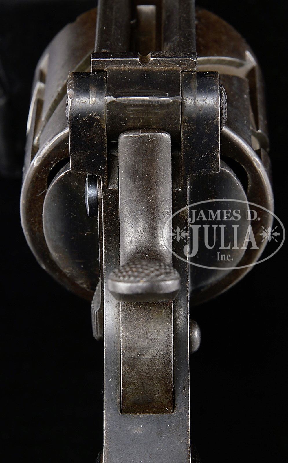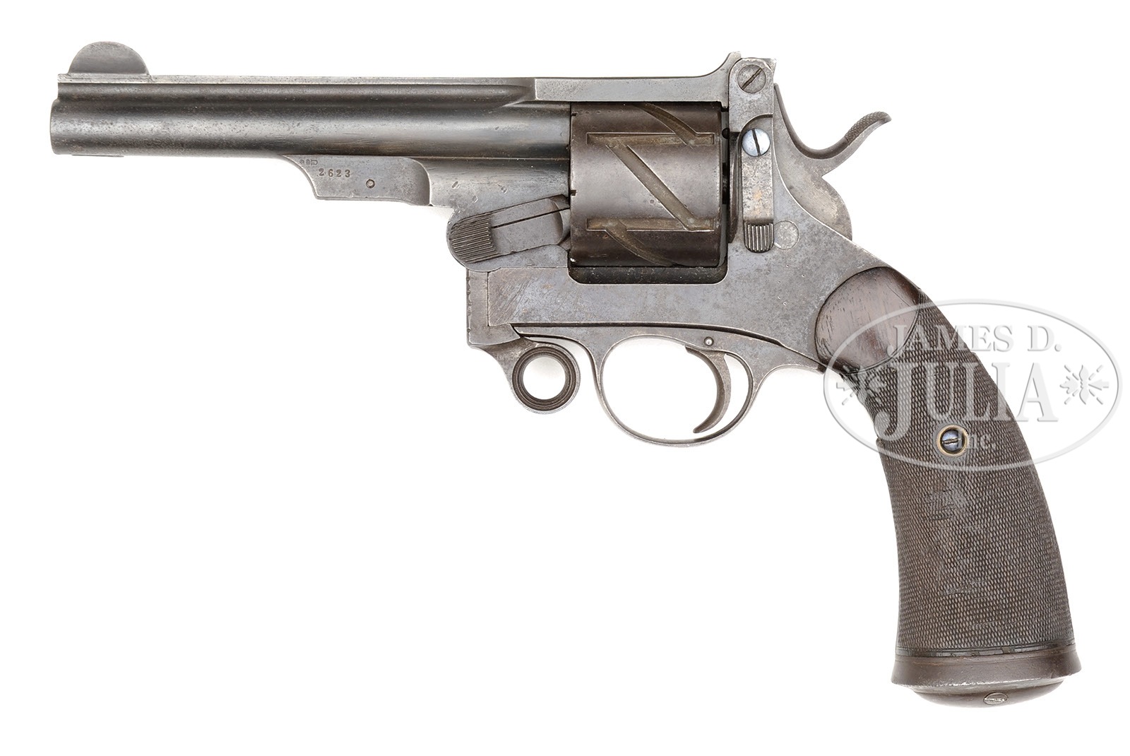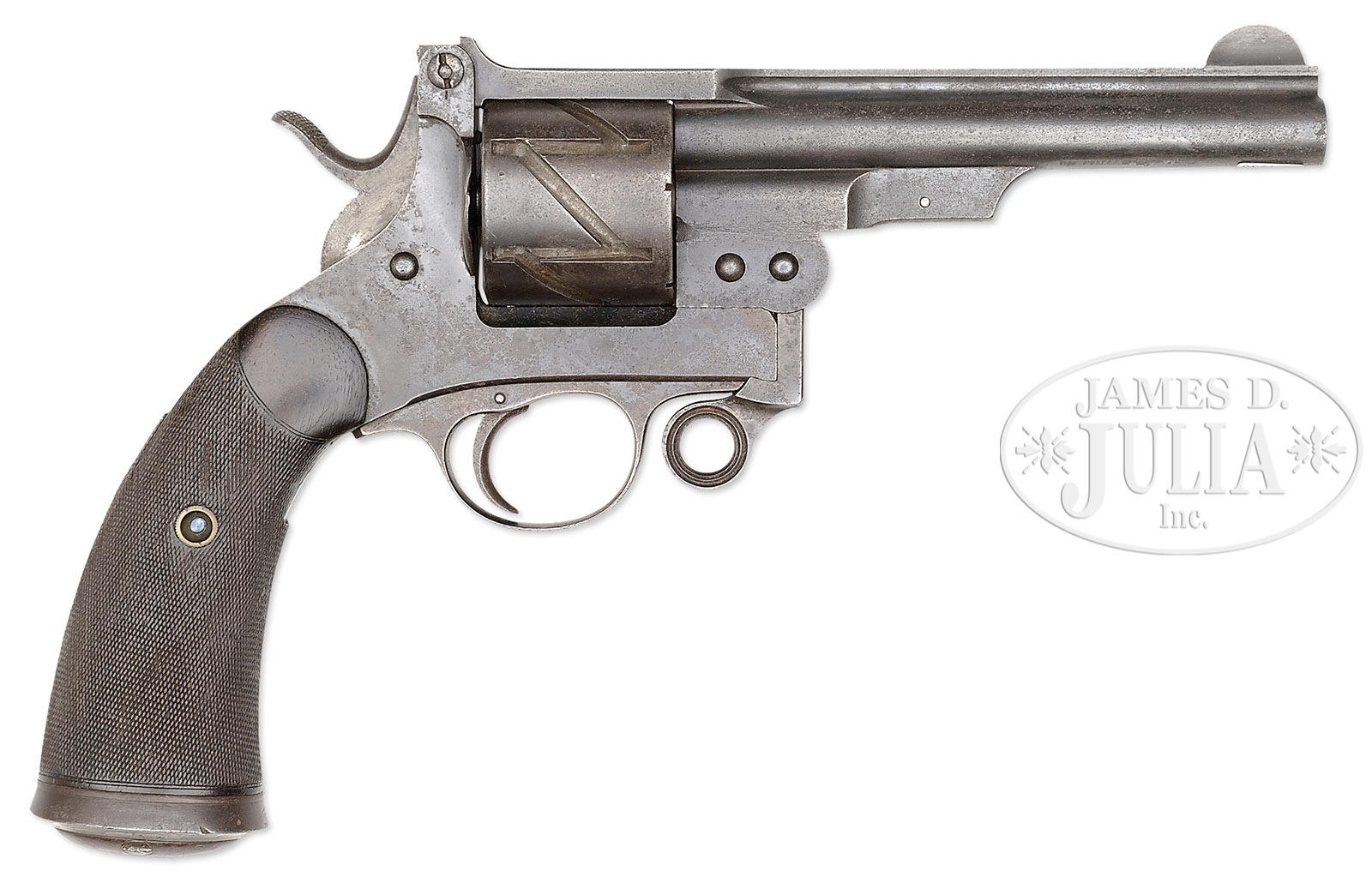 LARGE MAUSER ZIG-ZAG SINGLE ACTION REVOLVER.SN 2623. Caliber 10.6mm. Late, standard production, Mauser Zig-Zag Revolver with blued finish and ribbed 5.5″ bbl having an integral front sight. Marked on the top rib “WAFFENFABRIK MAUSER OBENDORF A/NECKAR”. Top strap has an open slot. Cylinder has the unusual feature of the “Zig-Zag” pattern around the outside diameter that acts as a slot for the hand to rotate the cylinder for the next shot. Left front side of the frame has a thumb safety that locks the cylinder by means of notches in the protruding rim. In front of the bottom frame is a lever that attaches to the bbl lug, that, when opened, allows the bbl to tip up for reloading and confirms a matching cylinder. The frame is fitted with a special 2-pc, full checkered, sharply angled walnut grip whose butt is protected by a metal cap. Production numbers of the zig-zag revolver are unknown but believed to be extremely limited with few sold in the U.S. Although made in several calibers, (7, 9, 10.6mm) the big bore model is considered to be the most desirable. PROVENANCE: Collection of Dr. Geoffrey Sturgess. CONDITION: Largely a blue-brown gun with considerable oxidative toning. Overall, less than 25% rust blue. The fire blued cylinder, cylinder stop, and safety lever have oxidized to a uniform brown. Very little of the original case-hardening remains on the take down lever and the only discernible case colors of the hammer remain in protected areas. Moderately bright bore with sharp rifling and mild oxidation. Grips are period special replacements with very fine checkering. Scattered superficial dents, particularly on the left side. Mechanically perfect with secure locking of each cylinder. 4-52567 LMA22 (4,000-6,000) – Lot 3008