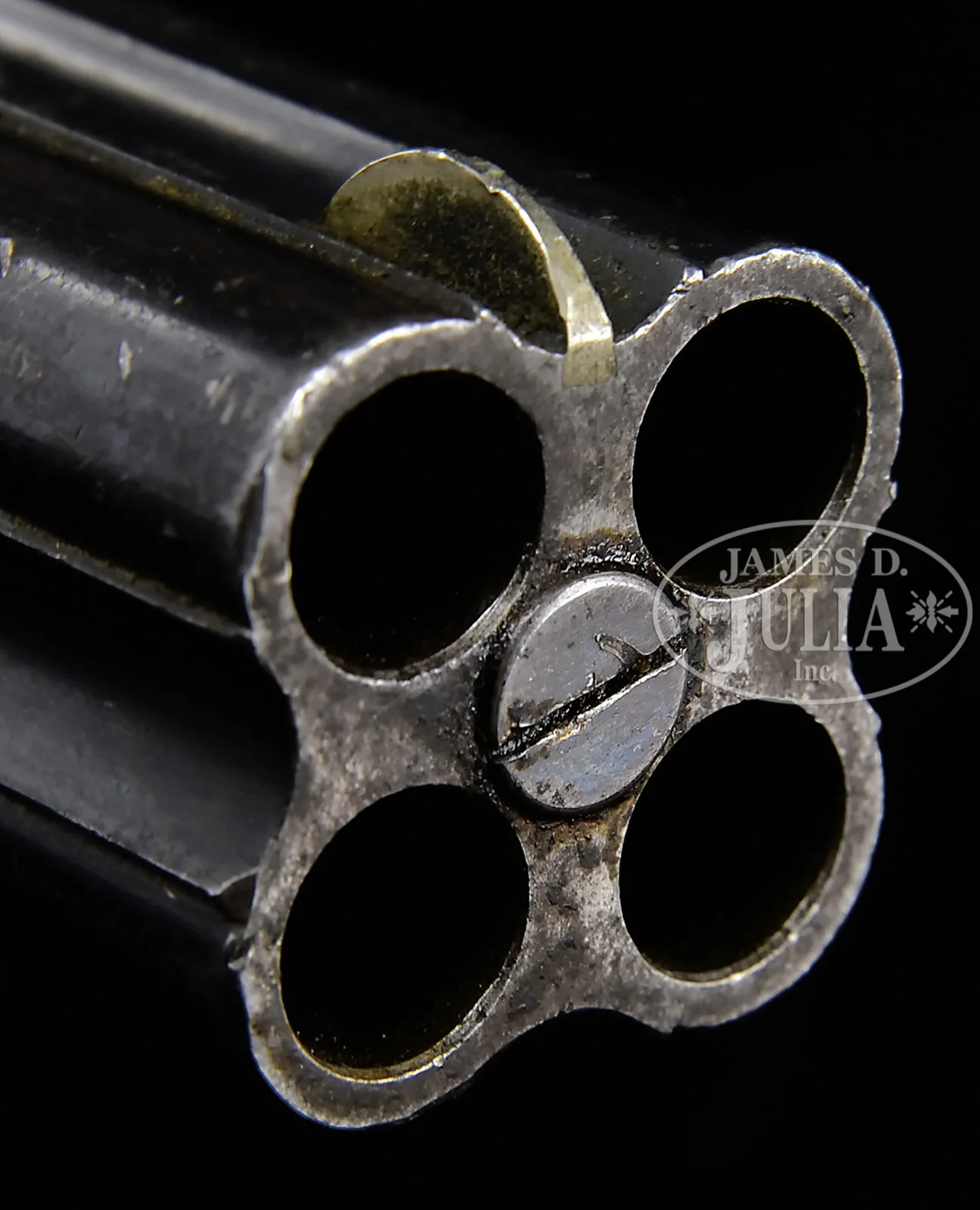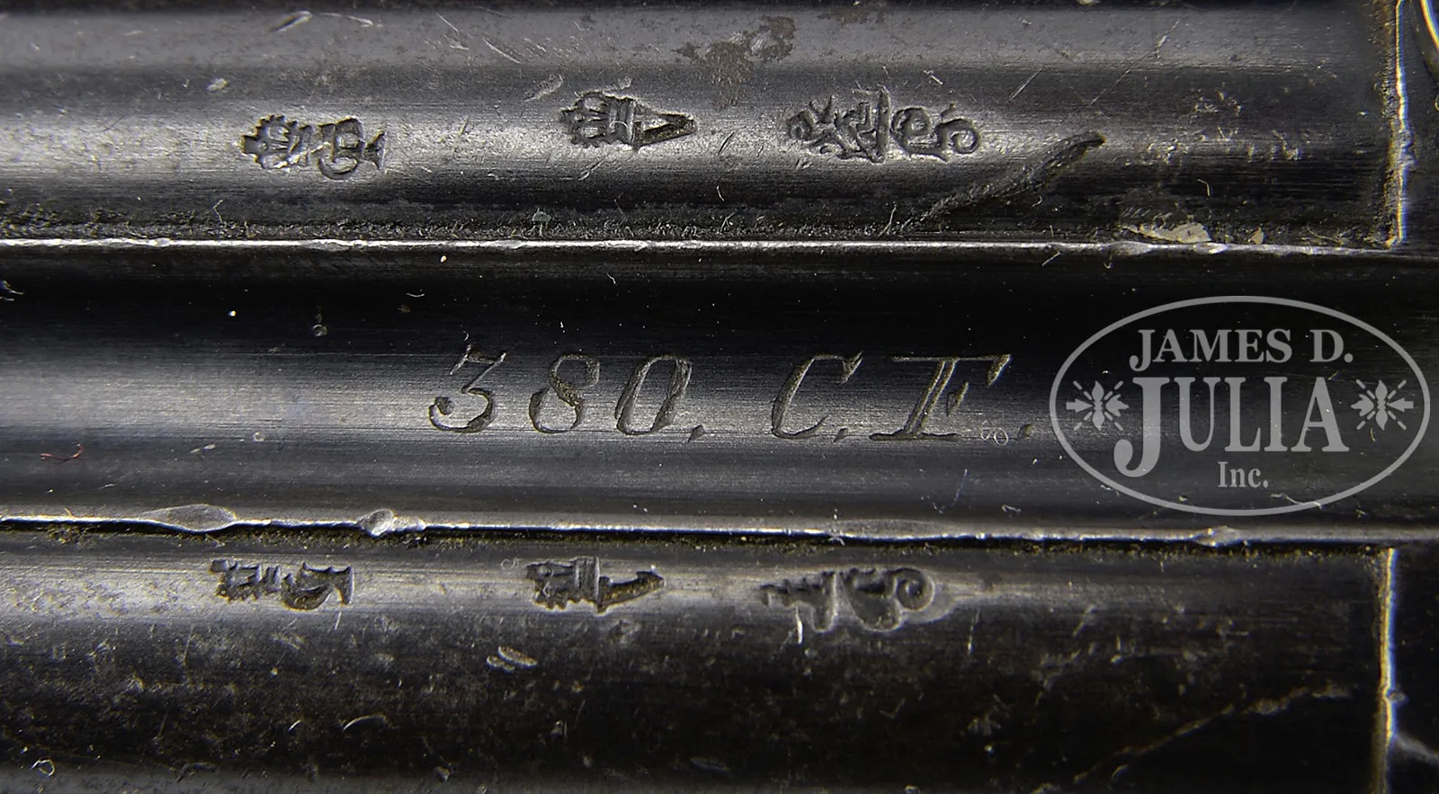 SN 8145. Cal. .380″. 4 Bbl Lancaster with 4-1/8″ bbls, fixed front and rear sight. Rib recess marked “CHARLES LANCASTER (PATENT) 15 NEW BOND ST, LONDON”. Oval bore bbls. Fitted with German silver blade front sight, and marked on left bbl flute “380.C.F.” London black powder proofs are on left side of bbls. Hammerless O/U receiver has integral V-notch rear sight and lever latch engaging two dogs on breech ends of bbls that have a toggled extractor system. Hand engraved SN under trigger guard bow. Birds head grip, with backstrap serrations for enhanced gripping, has lanyard swivel at bottom rear, and checkered walnut grips. Assembly #50 is marked under the bbls, on the frame under the grips and marked in pencil on each panel. PROVENANCE: Collection of Dr. Geoffrey Sturgess. CONDITION: Bbls retain 80% orig rust blue with thinning, fine scratches and scuffs. Comparable condition, orig midnight blue on action though the finish on the frontstrap is reduced to 50% and the trigger guard has largely browned. Fire blue on the trigger is 40-50% with the trigger face transitioned to a pleasant patina. Grips are in keeping with the overall condition, having numerous surface dings and minor blemishes. A chip measuring 5/8″ x 1/4″ is missing from the bottom of the left panel. Bores are bright with mild erosion. Perfect manual function. 4-52240 LMA124 (3,000-4,500) – Lot 3009