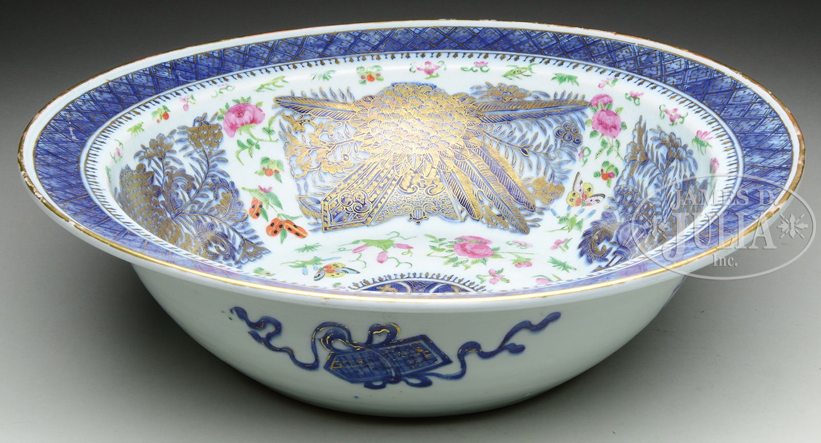 LARGE CHINESE EXPORT BASIN.China, 19th c. The large basin decorated with blossoming lotus and chrysanthemum flowers in the center amidst butterflies and other auspicious items, the rim with brocade pattern over blue ground, export porcelain. SIZE: 16-1/2″ dia x 4-3/4″ h. CONDITION: Age related wear and slight loss of color and cracks under glaze. 7-75314 (300-500) – Lot 3010
