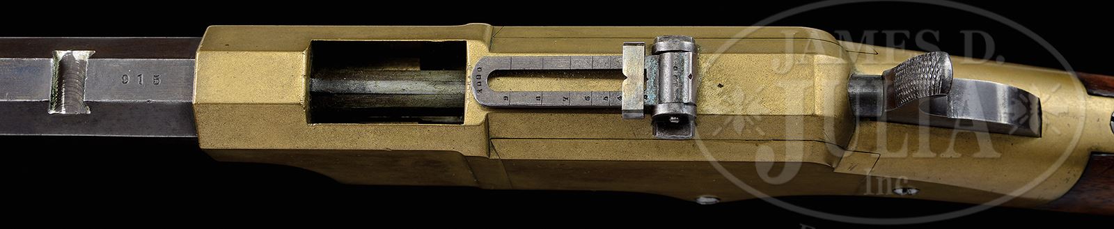 EARLY HENRY MODEL 1860 LEVER ACTION RIFLE.SN 915. Cal. 44 RF Henry. Very early Henry with 24-1/4″ oct bbl that has integral magazine, rnd top nickel silver front sight, empty seat in top flat of bbl with 1000-yd Henry ladder rear sight in the dovetail in top flat of receiver. Mounted with uncheckered, straight grain American walnut buttstock with straight grip and early, rnd heel brass buttplate with large trap and corresponding large hole in the wood to accommodate a 4-pc hickory wiping rod (not present). SN was observed on top flat of bbl just forward of the receiver, left side of lower tang under the wood, top tang channel of buttstock & inside buttplate tang. Rnd portion of the bbl, under the loading sleeve, is marked with the assembly number “388”, which number is also found on rear face of loading sleeve. Rifle has virtually all of the early features including small bbl address, 1000-yd ladder rear sight, very sharp radius on top rear of receiver, small loop lever, small lever lock tab, perch belly stock, rnd heel buttplate and small follower tab without recess in the frame. All of the tang & buttplate screws are matching numbered to this rifle. These early rifles (this one produced in about 1862) almost universally saw service during the Civil War, mostly as private purchase buy individual soldiers or private donors to equip an entire regiment. After the war, Henry rifles mostly went West in the great migration of Manifest Destiny where they were an everyday working tool by citizens of all walks of life. They usually saw very hard service and are rarely found today in any condition. PROVENANCE: The Estate Collection of Phil A. Bleakney, Jr. CONDITION: Fine, all matching. Bbl & magazine retain strong blue in the gullets with the balance as smooth, dark, plummy/brown patina. Receiver & sideplates show sharp edges with very minor, tiny nicks and shows a lightly cleaned, medium mustard patina. Hammer shows dark case colors on rear edge and the lever is a dark brown patina. Buttstock is sound with a bruise near the left heel and a few light nicks & dings and retains most of an old restored finish. Buttplate is matching patina to the receiver. Follower spring is a replacement. Mechanics are fine. Strong bright bore with scattered, shallow pitting. 49059-2 JR (22,500-32,500) – Lot 3010