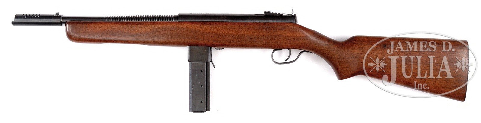**BEAUTIFUL HIGH CONDITION HARRINGTON & RICHARDSON RISING MODEL 50 MACHINE GUN (CURIO & RELIC).SN 6910. Cal. 45 ACP. 13-3/4″ bbl with compensator. This is a beautiful, probably police issue Reising select fire machine gun includes four 20 round mags and a spare bolt as well as a “Wolfe Springs & Co” spring kit. These guns were used by the Marine Corps in the Pacific during WWII as an alternative when there were insufficient Thompson’s available. These were also used by police as well as security personnel. The Reisings had an accuracy advantage over the Thompson’s in that they fire from a closed bolt. Firing mechanism moves smoothly when operated by hand, this weapon appears fully functional. This is a National Firearms Act item and requires BATF approval prior to transfer. This weapon is fully transferable on an ATF form 3 or form 4 as Curio & Relic eligible. CONDITION: Overall appearance and finish is excellent, deep lustrous orig blue finish. Mags also near excellent as is spare bolt, some slight thinning and blemishing to the finish just forward of rear sight. Stock has some dings, handling marks, with a small knot plug mid-way between buttplate and pistol grip on lower right side, but very attractive overall. Bore is shiny and bright. These Reisings have enjoyed an increase in popularity in recent years, and they are very comfortable to shoot. 50273-4 JWK42 (4,000-6,000) C&R – Lot 3010 Click here to view provenance
